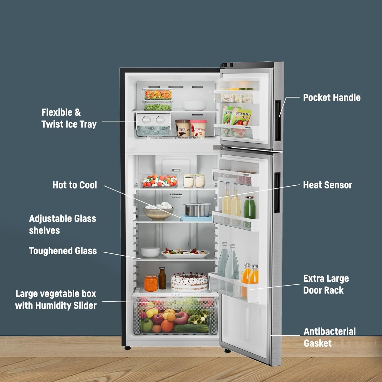 Additional Features : Easy Clean Back | Bigger size Vegetable Basket with humidity Control| LED Light | Premium Door Finish | Flexible & Twist Ice Tray | Egg Tray | Adjustable Feet | Bigger vegetable basket pullout @ 90° door opening