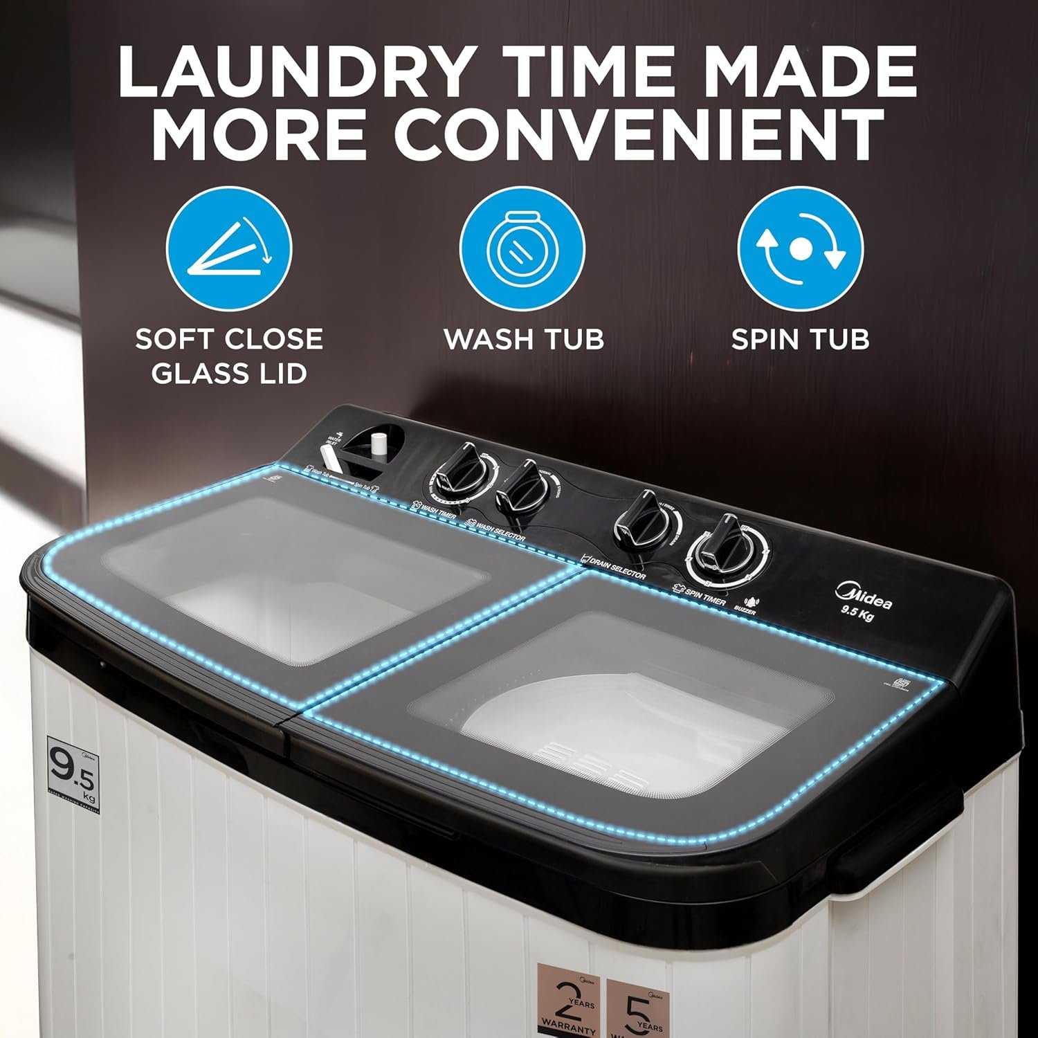 Midea 9.5 Kg 5 Star Toughened Glass Semi Automatic Top Load Washing Machine Black White (MWMSA095GPG(KW) Rust proof Body with 1300 RPM)