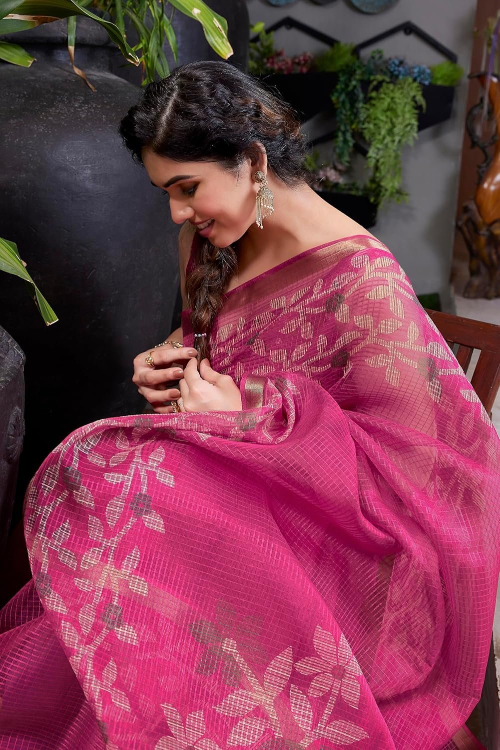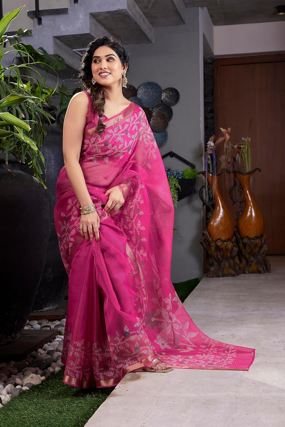 Crafted from a kota doriya blend fabric, this saree ensures comfort and ease of wear throughout the day.