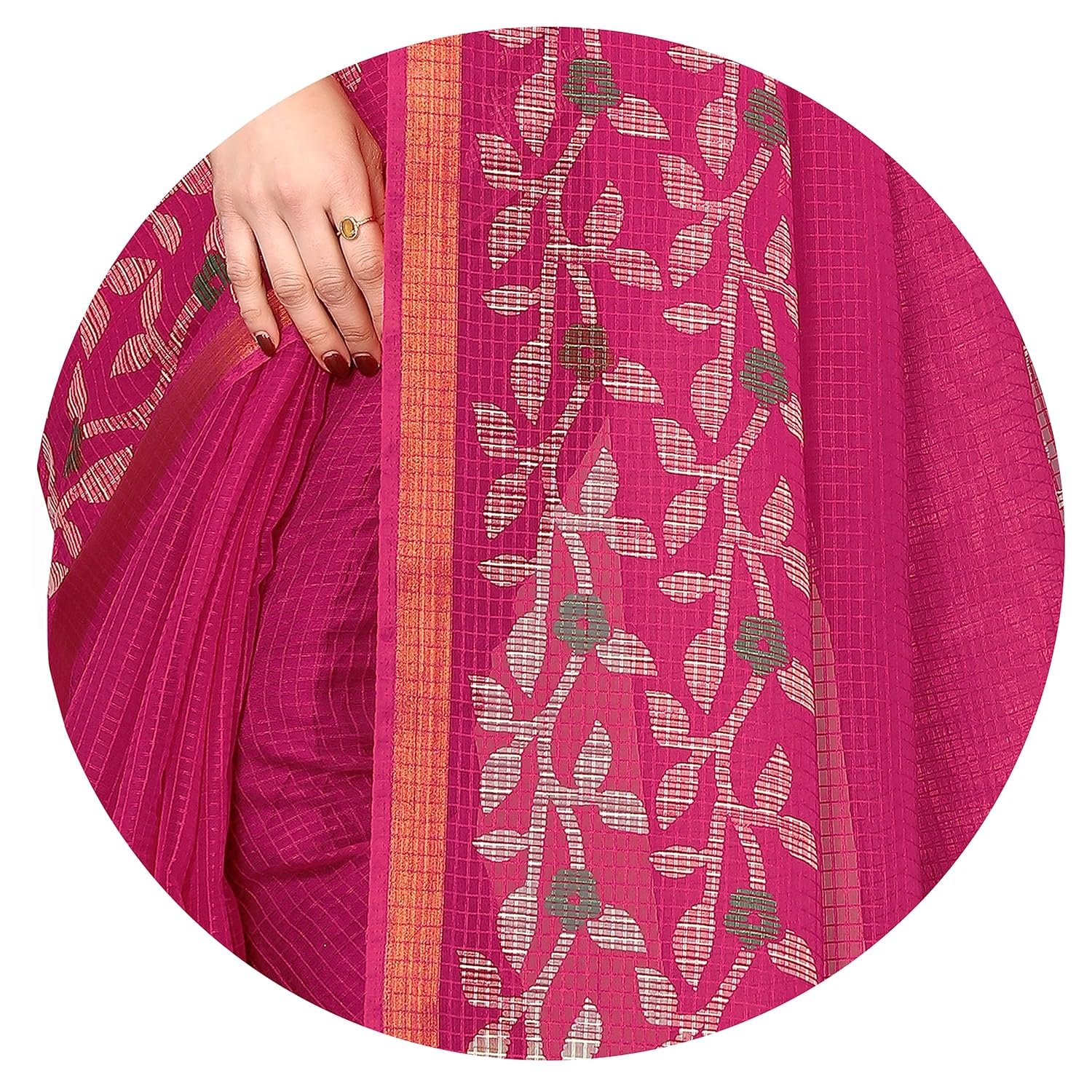 Intricately designed floral prints on kota doriya blend fabric, adding a touch of sophistication and charm to traditional attire.
