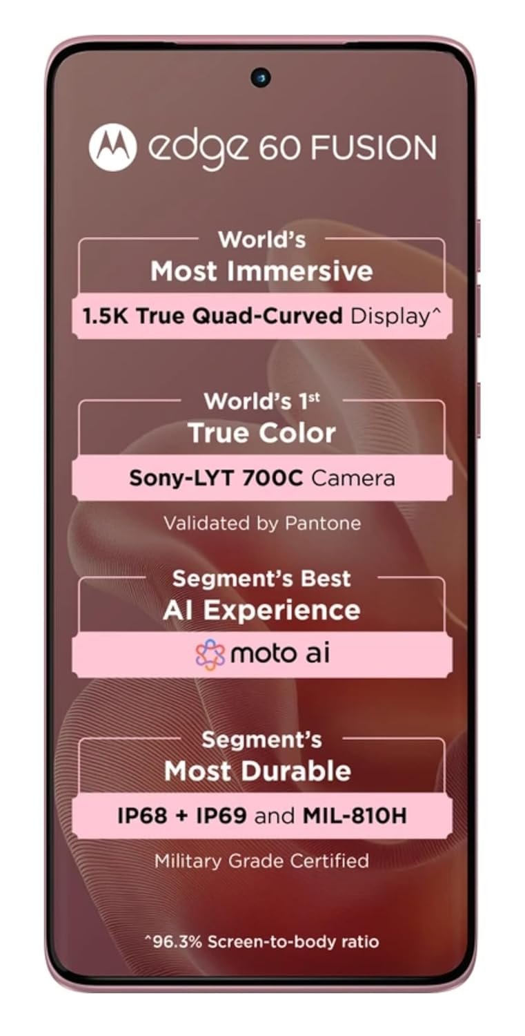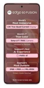 The Motorola Edge 60 Fusion 5G in Pantone Zephyr combines style and substance. It features a MediaTek Dimensity 7400 processor, a 6.67-inch pOLED display with a 120Hz refresh rate, and a 50MP main camera with OIS.1 A 5500mAh battery with 68W TurboPower charging ensures lasting performance.2