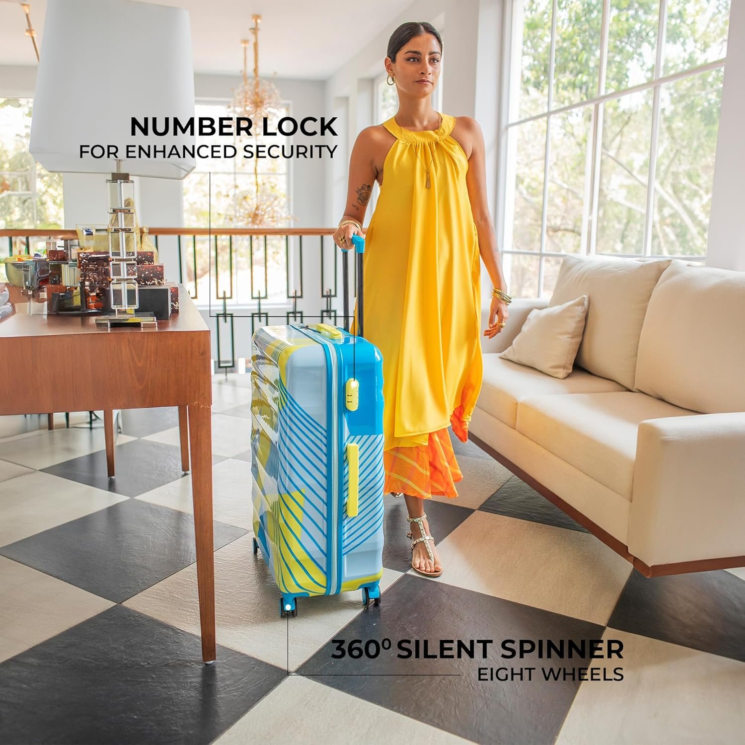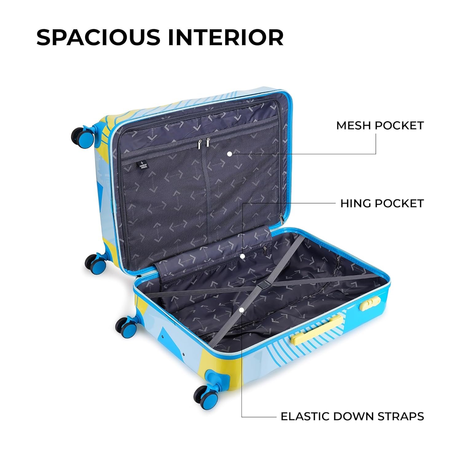 The telescoping handle ensures comfortable manoeuvring and easy pick-up, while additional top and side carry handles offer added convenience in lifting. 8 silent spinner wheels for a 360-degree rotation, ensuring smooth movement in any direction.