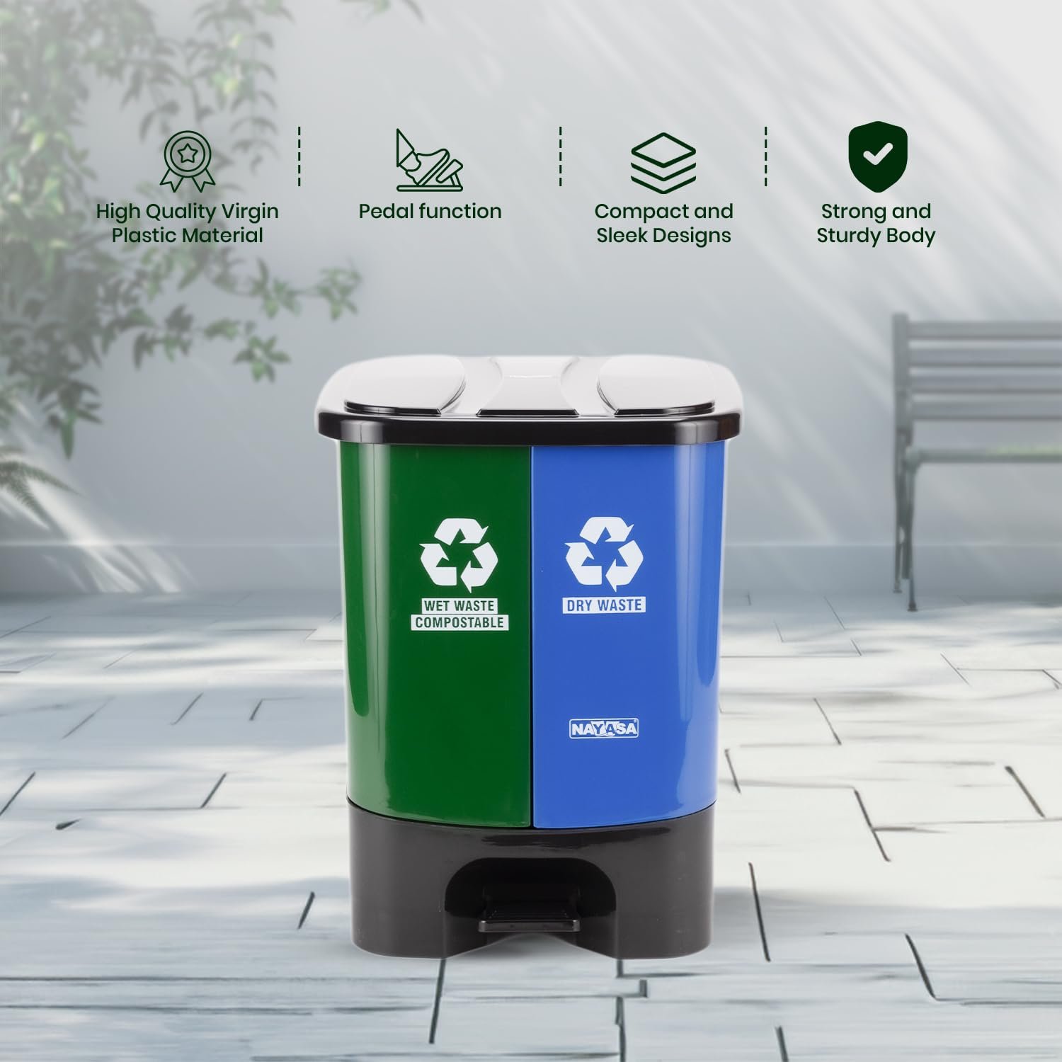 Nayasa 2-in-1 Pedal Dustbin – 33 L (16.5 L Each) | Dual Compartment Wet & Dry Waste Bin with Detachable Inner Bins | Hygienic Plastic Pedal Bin | Green & Blue