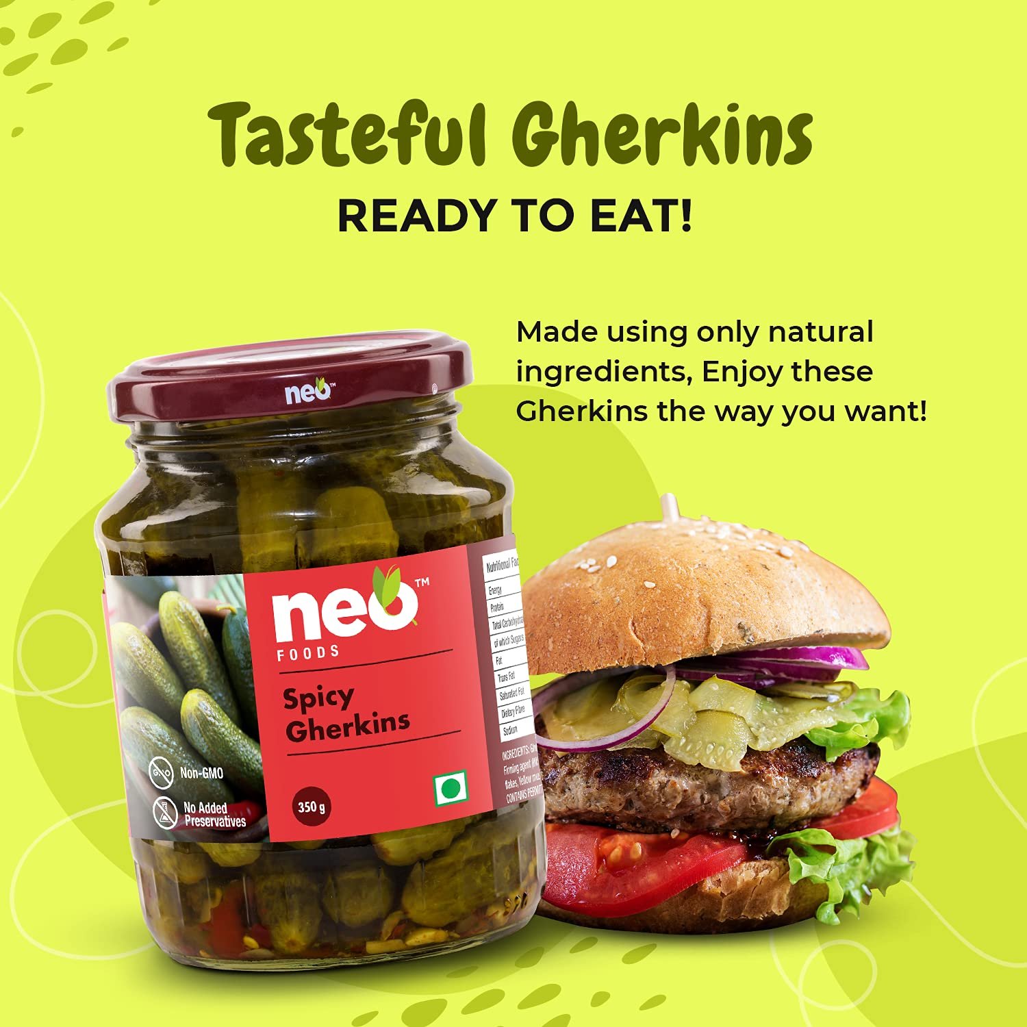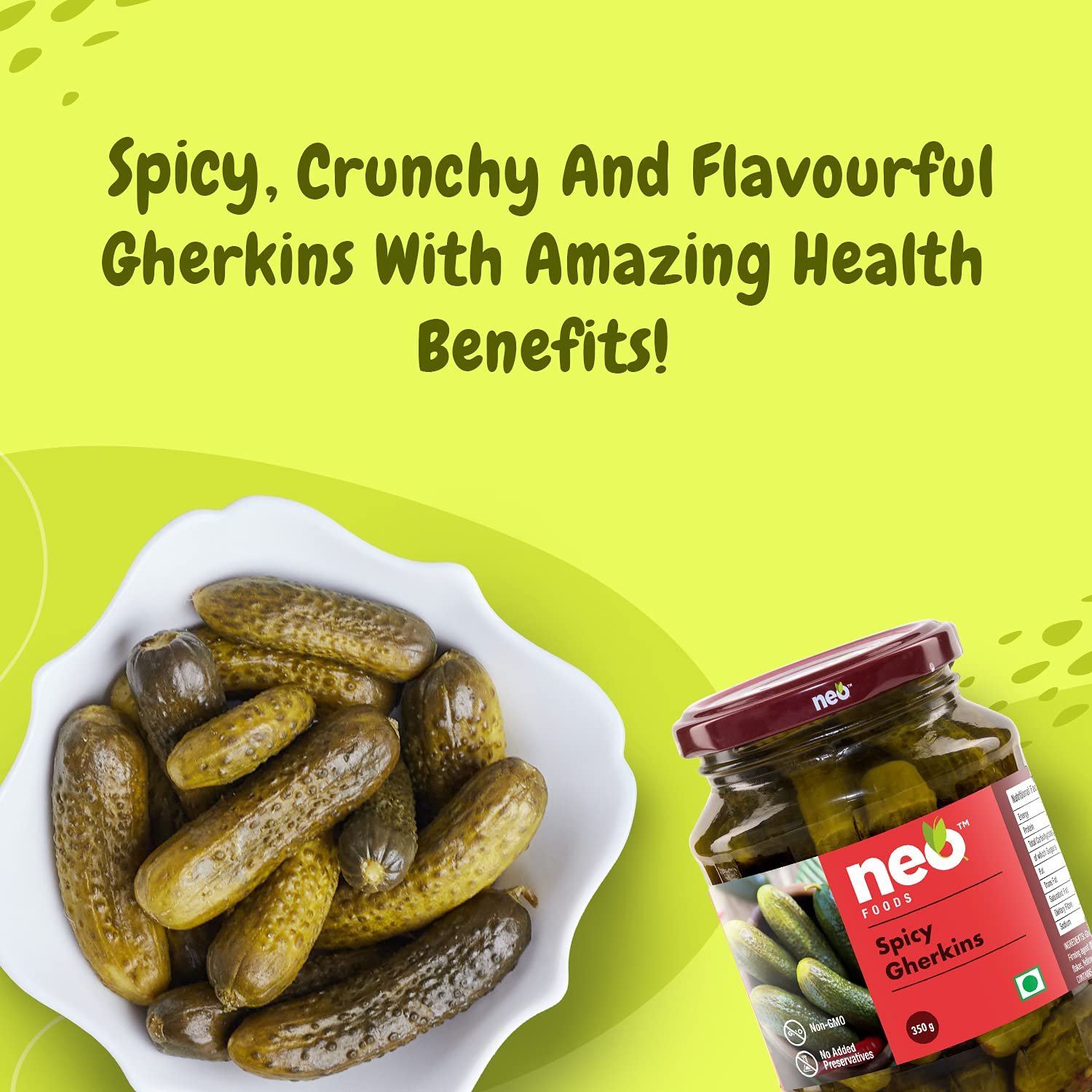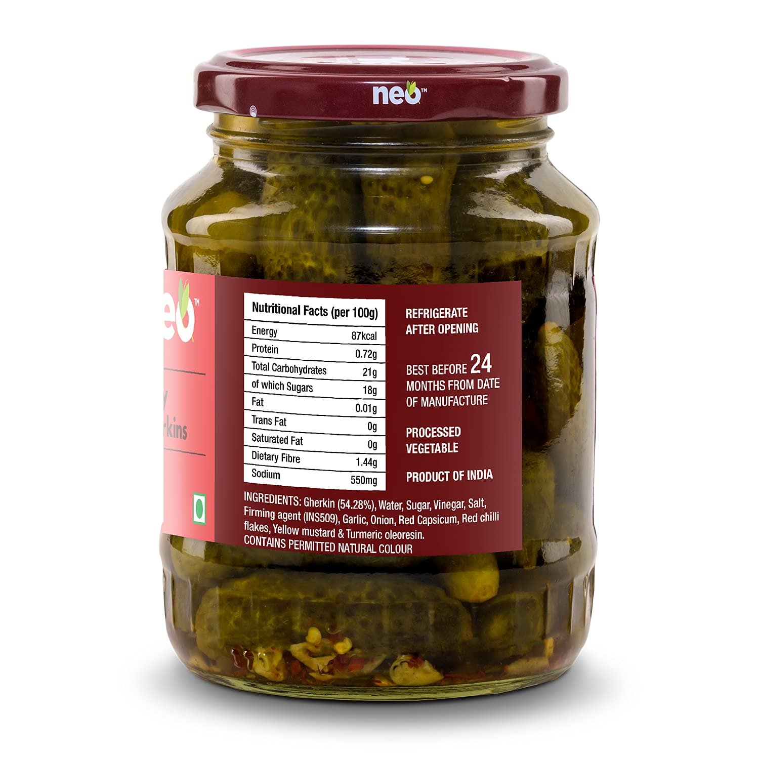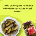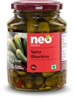 Neo Foods Spicy Gherkins are pickled cucumbers preserved in vinegar with some spices to intensify the taste & texture. Sweet, crunchy, and flavoursome, they can enhance the flavour of any meal. Sourced directly from farm under the supervision of our experienced agricultural team, eat them as it is and you’re sure to be delighted with their sharp flavour. Low in fat, choose these gherkins as your new snacking partner