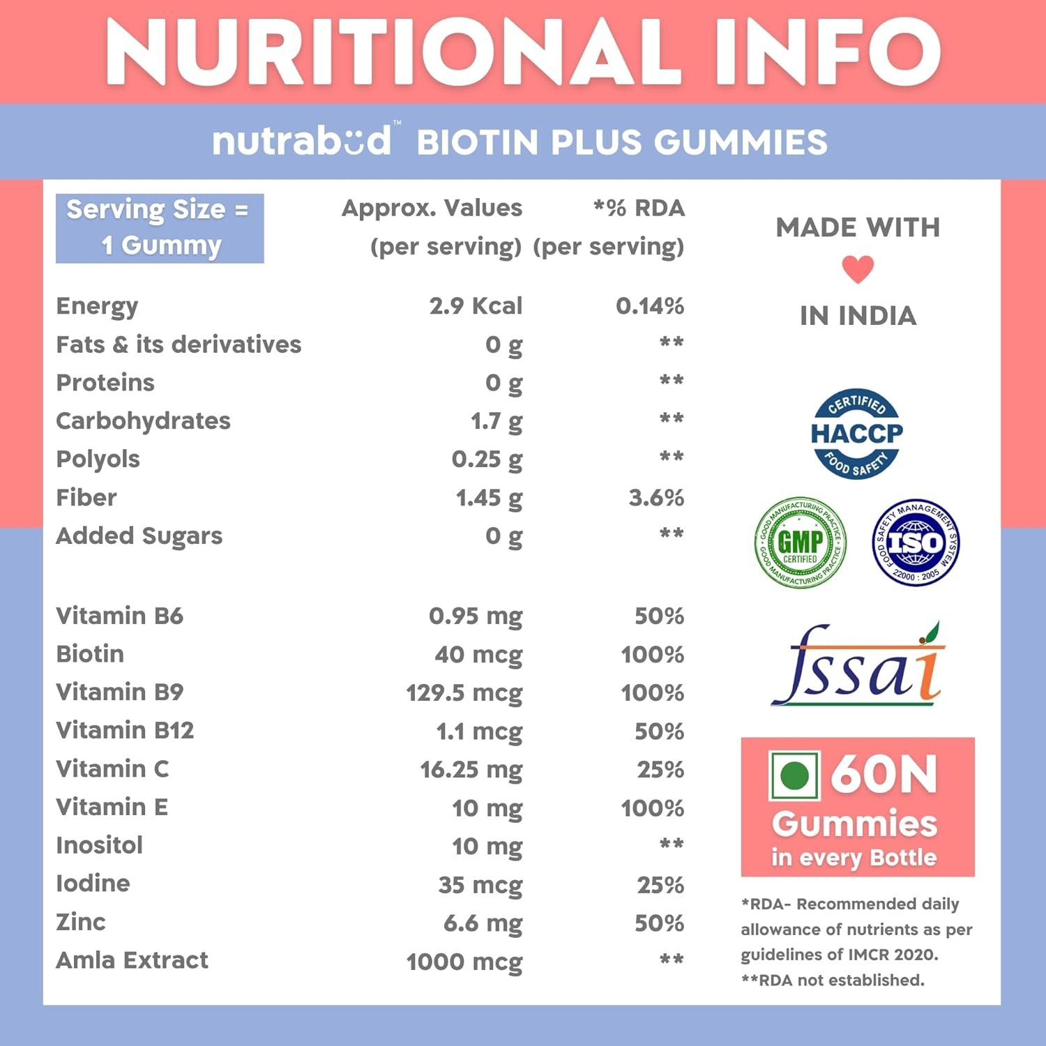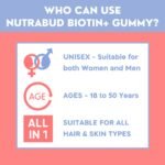 GIVES THE RIGHT NUTRITION – Nutrabud Biotin Gummies are formulated with of pure form of Bio-available Biotin, Zinc, Amla Extract & more that gives your hair, Skin & Nails the right nutrition. Prebiotic fiber in our gummies promotes fast and proper absorption of nutrients, resulting in improved health of your Hair, Skin & Nails.