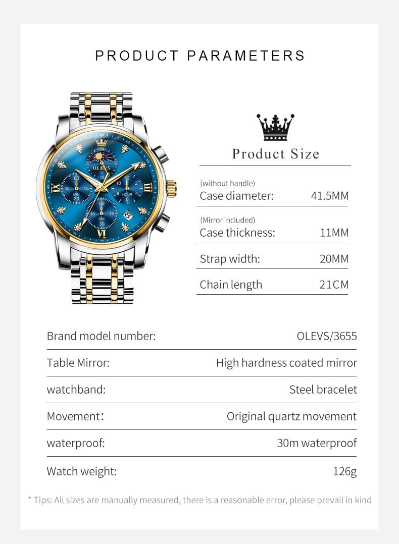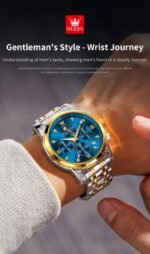OLEVS Chronograph Watches for Men Original Analog Quartz Black Stainless Steel Chain Luxury Dual Time Zone Moon Phase Date Waterproof Men’s Wrist Watch