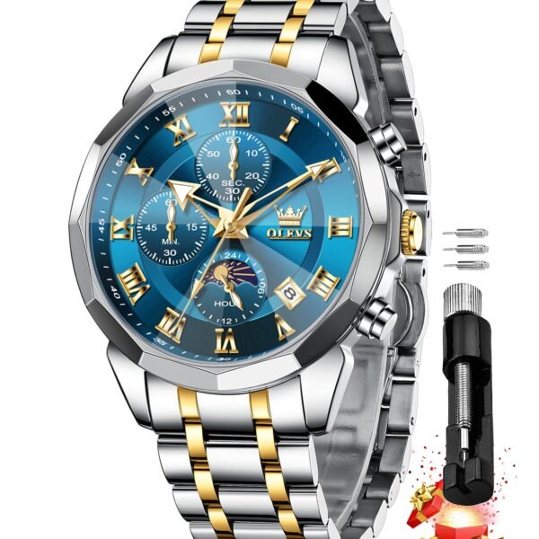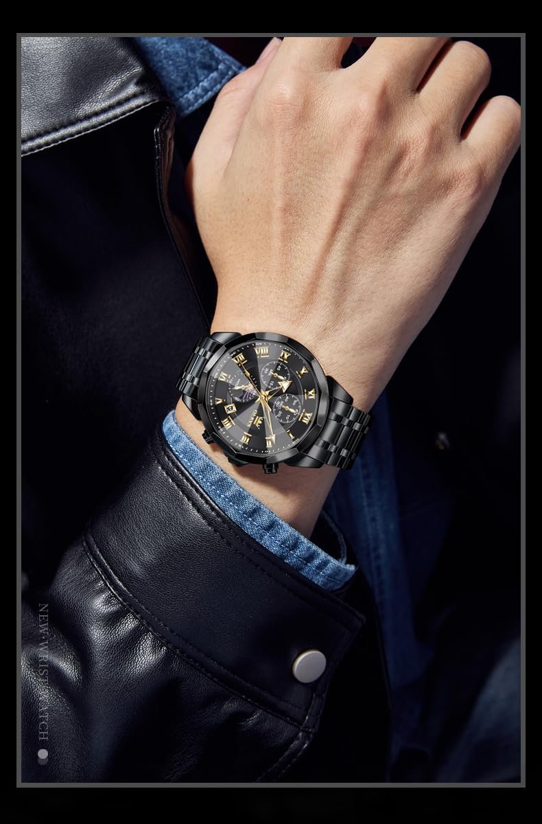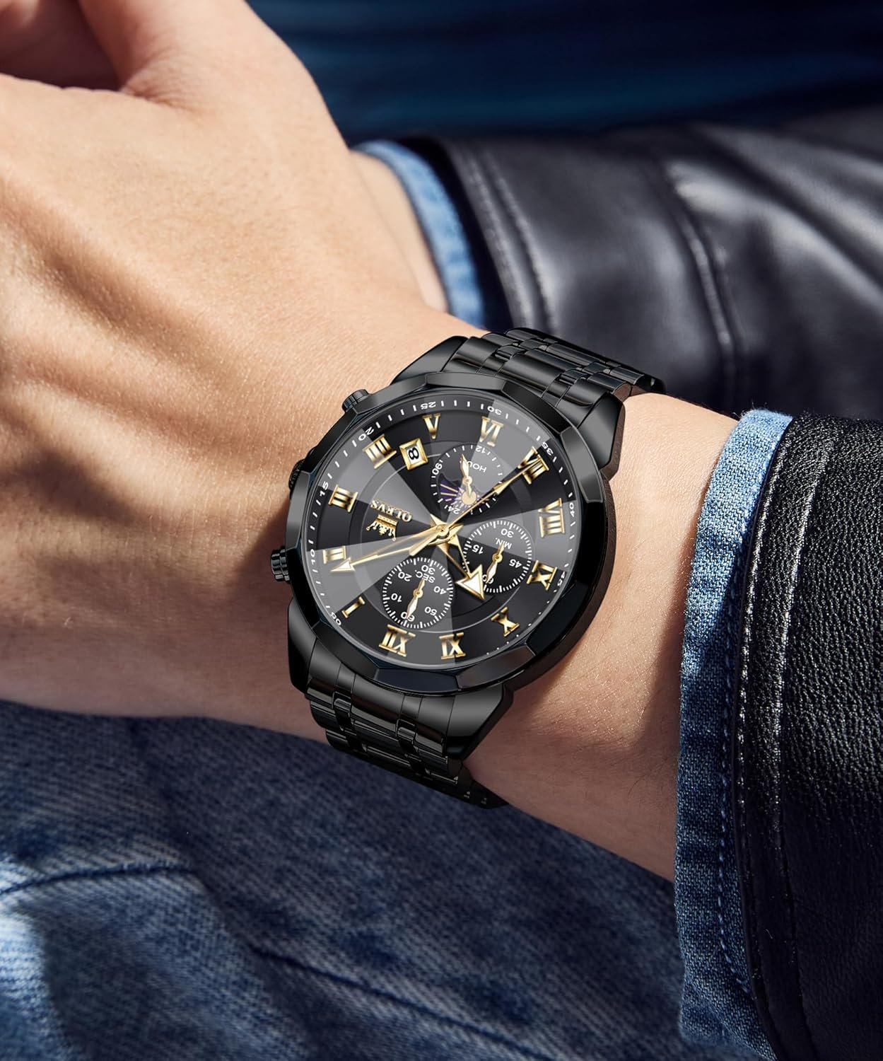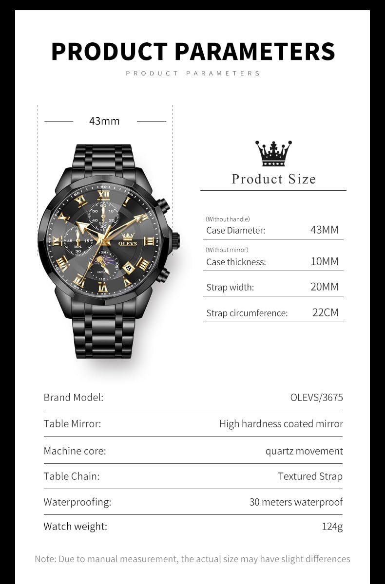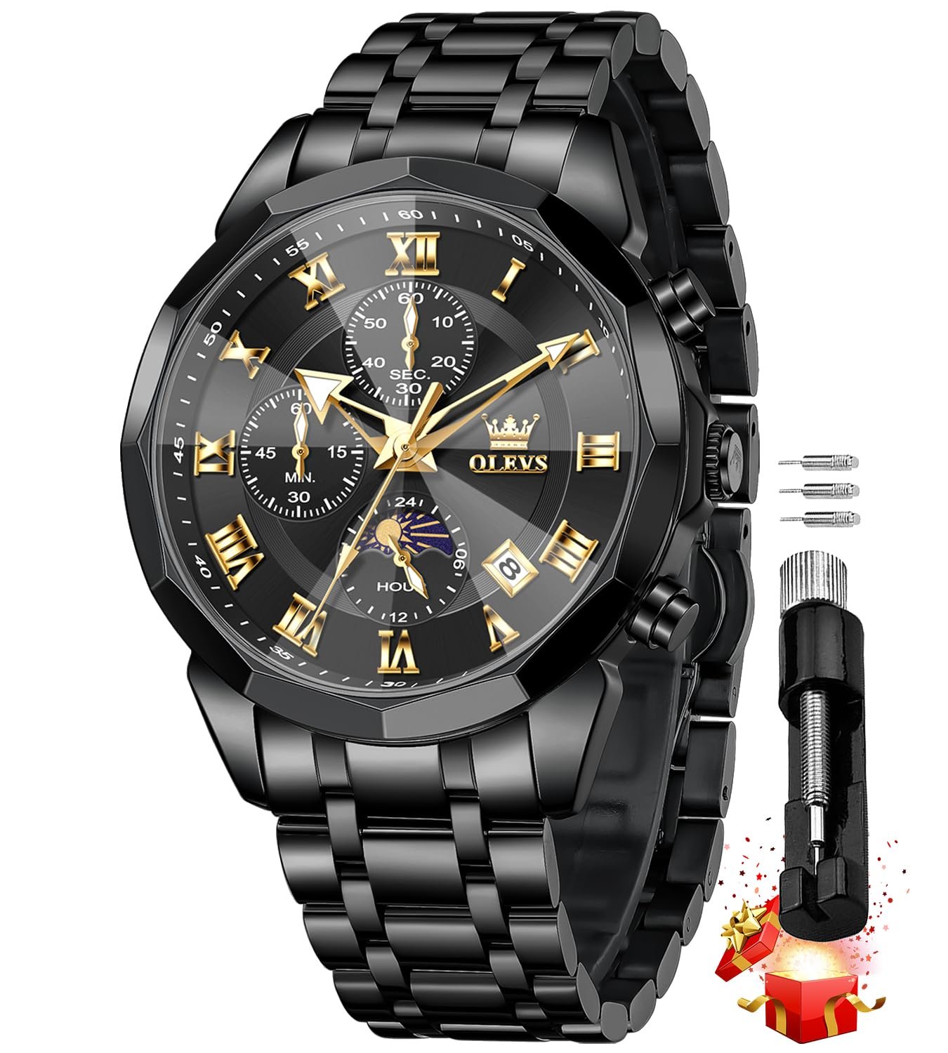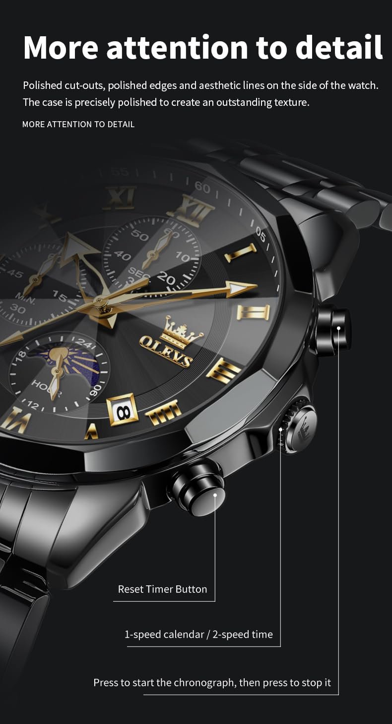 OLEVS Chronograph Watches for Men Original Analog Quartz Black Stainless Steel Chain Luxury Moon Phase Date Waterproof Branded Formal Men’s Wrist Watch