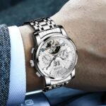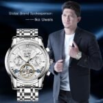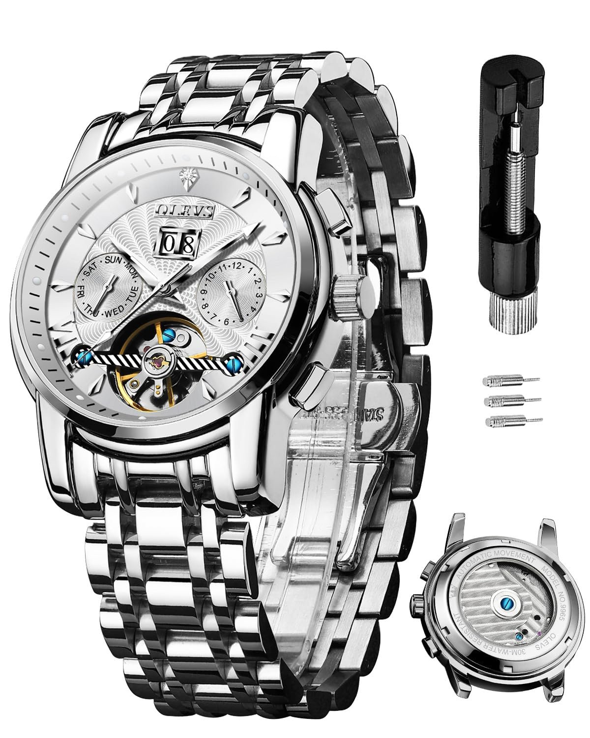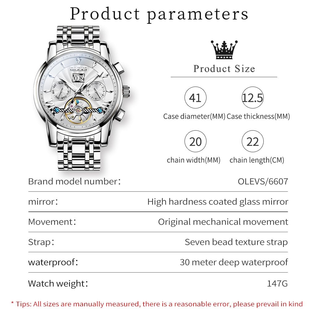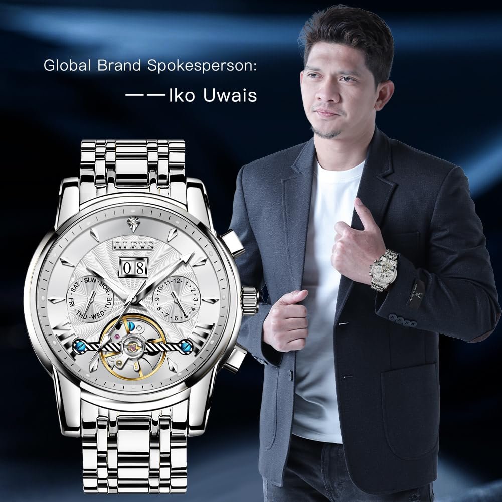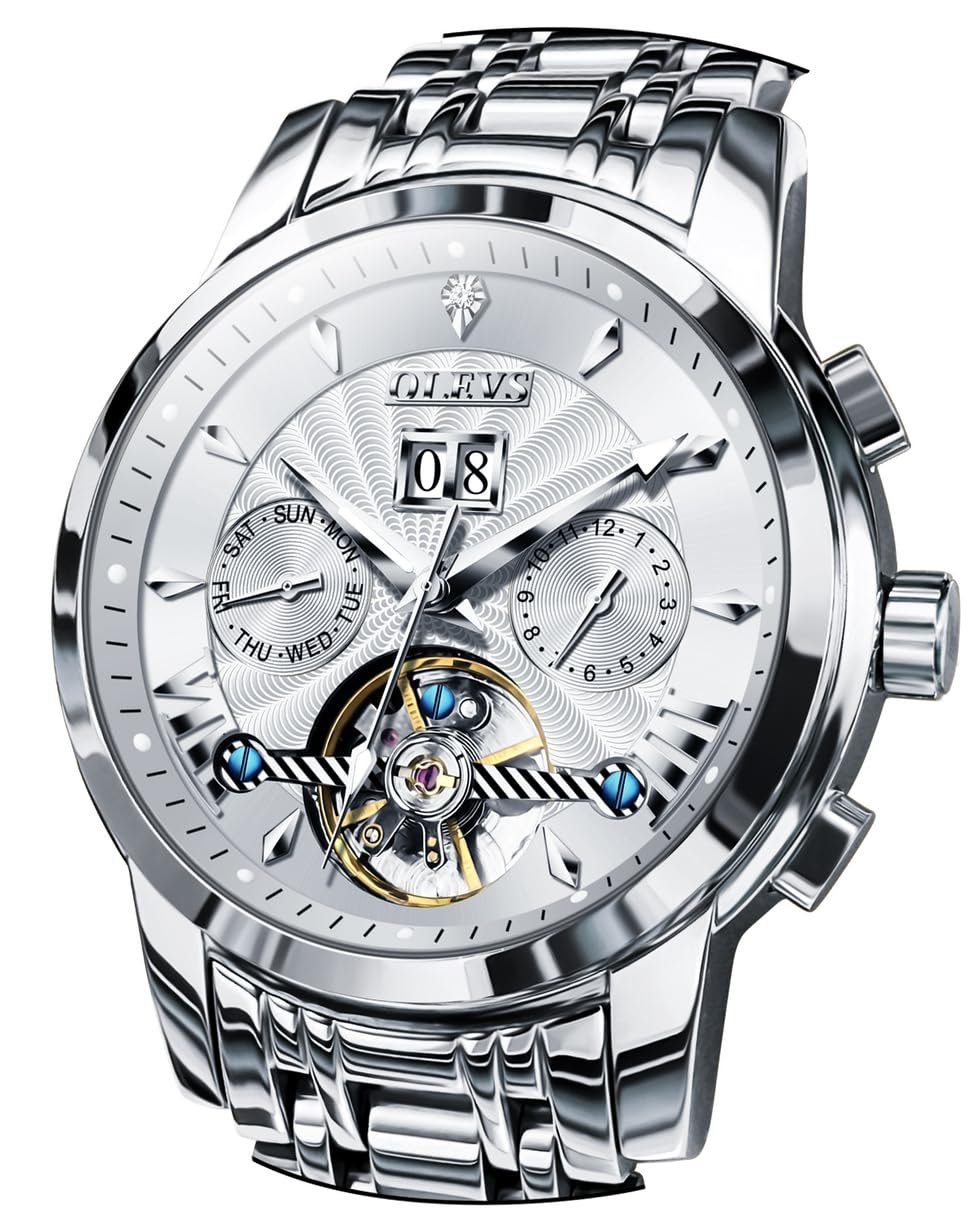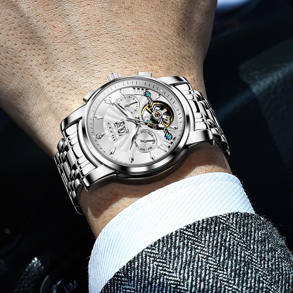OLEVS Watches for Men Automatic Skeleton 5 Hands Mechanical Luxury Watch Classic Calendar Stainless Steel Waterproof Mens Wrist Watch