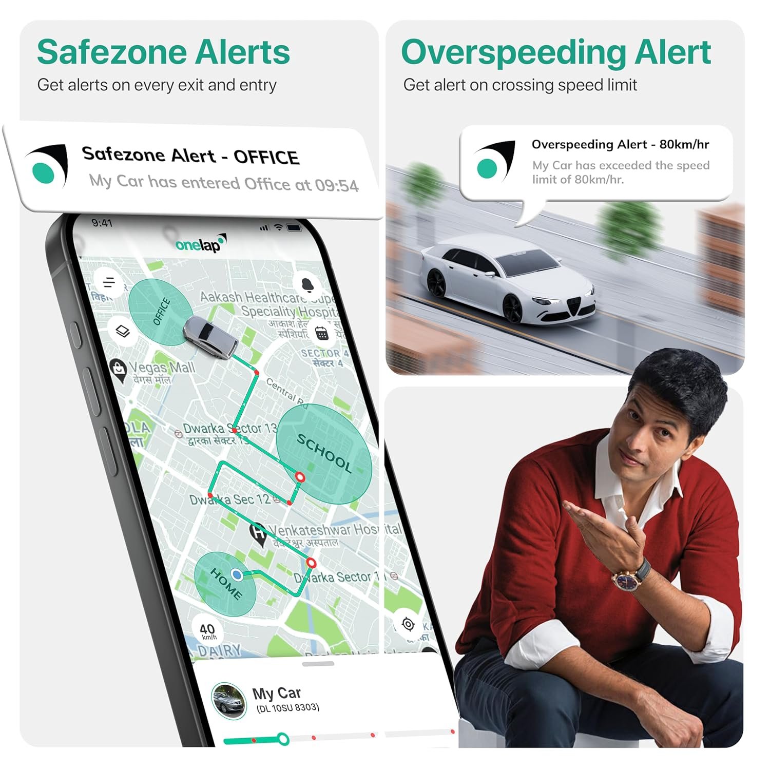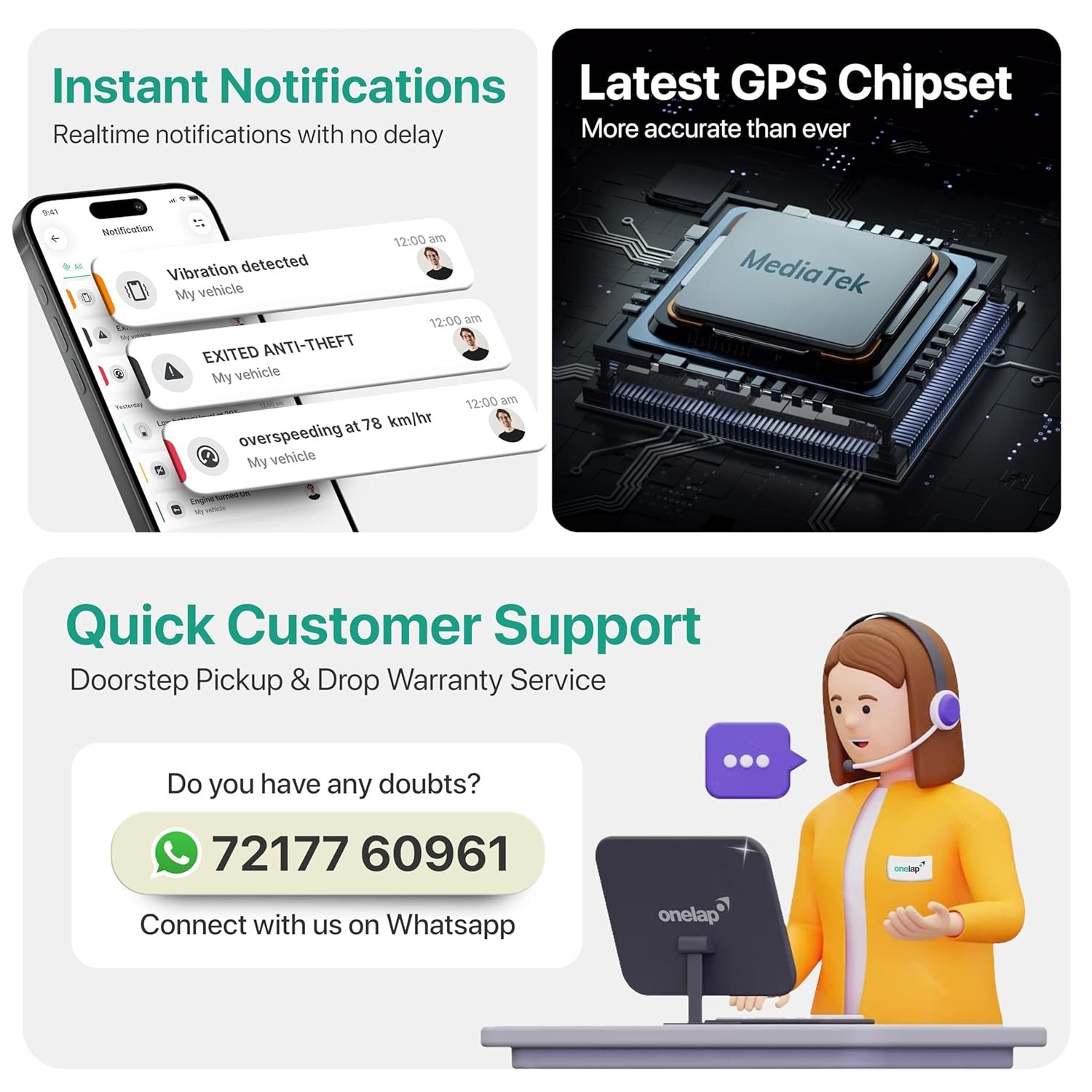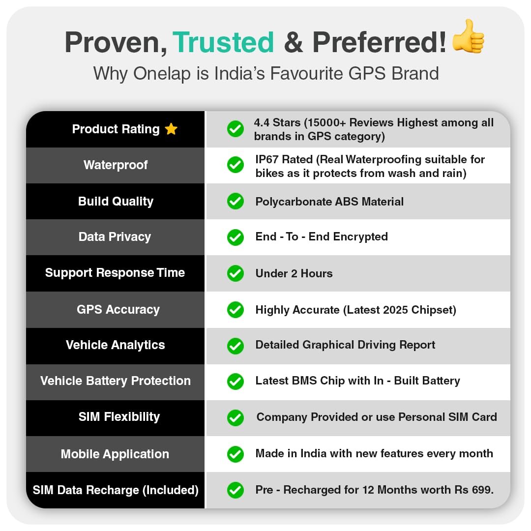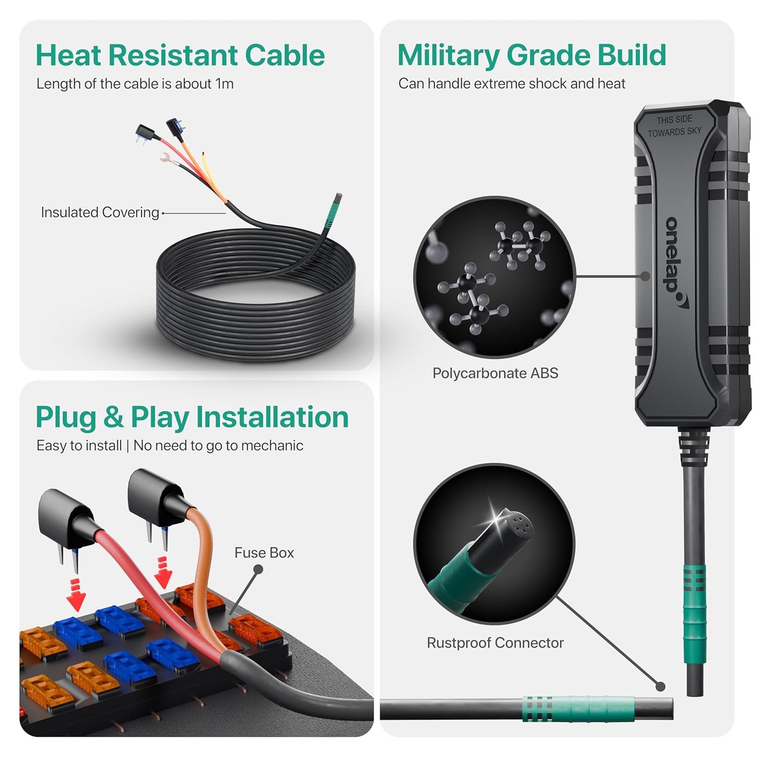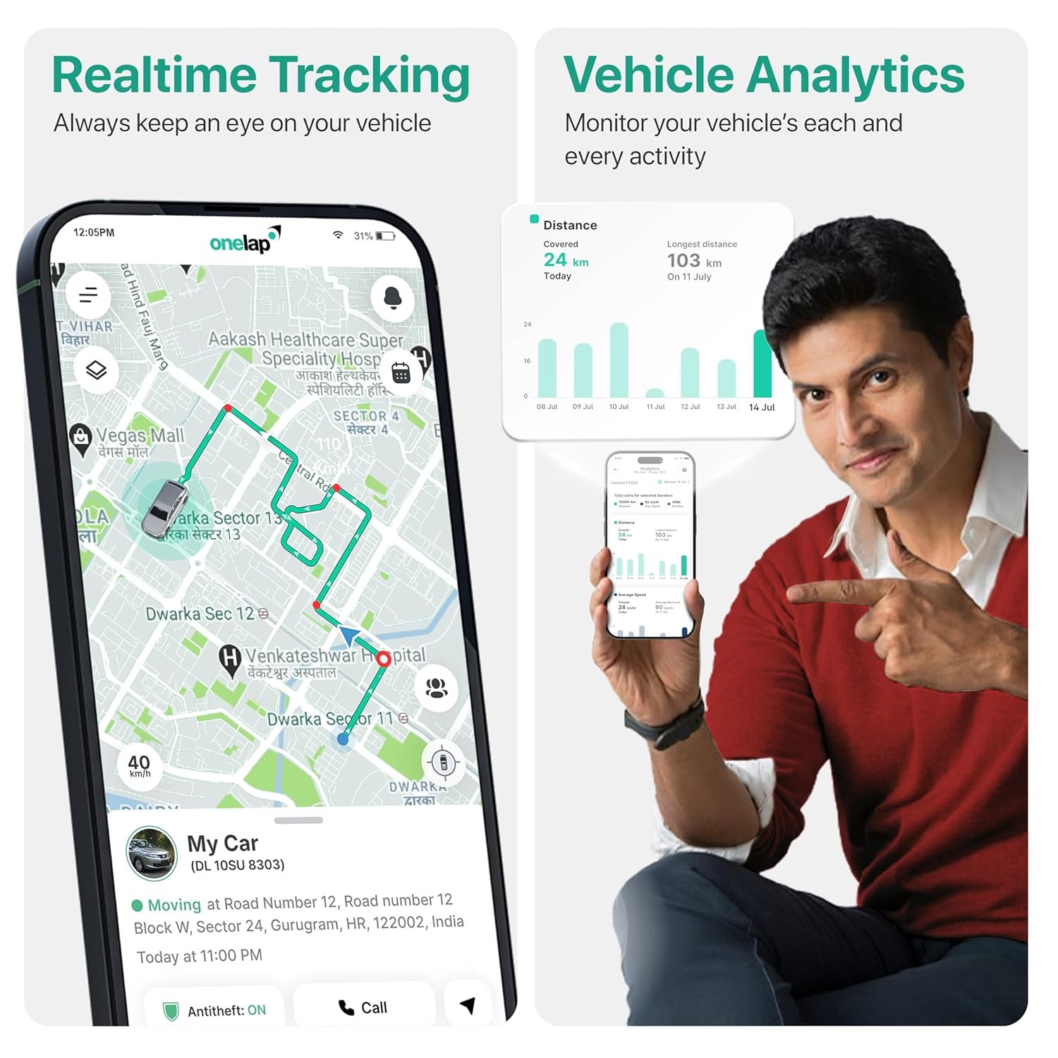 ✨Package Includes -Onelap Locoshield IP67 100% WaterProof GPS Tracking Unit (Compatible with both Key and Push button Start vehicles) with 1 Year of Doorsteps Replacement Warranty and Android & iOS App (MAKE IN INDIA) + 1 Year of Location Data Storage on App Cloud Server + 12 Months of Pre-Recharged Activated 4G Data Device SIM Card. You can also remove this SIM Card and use your own Normal SIM card with a Recharge from Next Year.