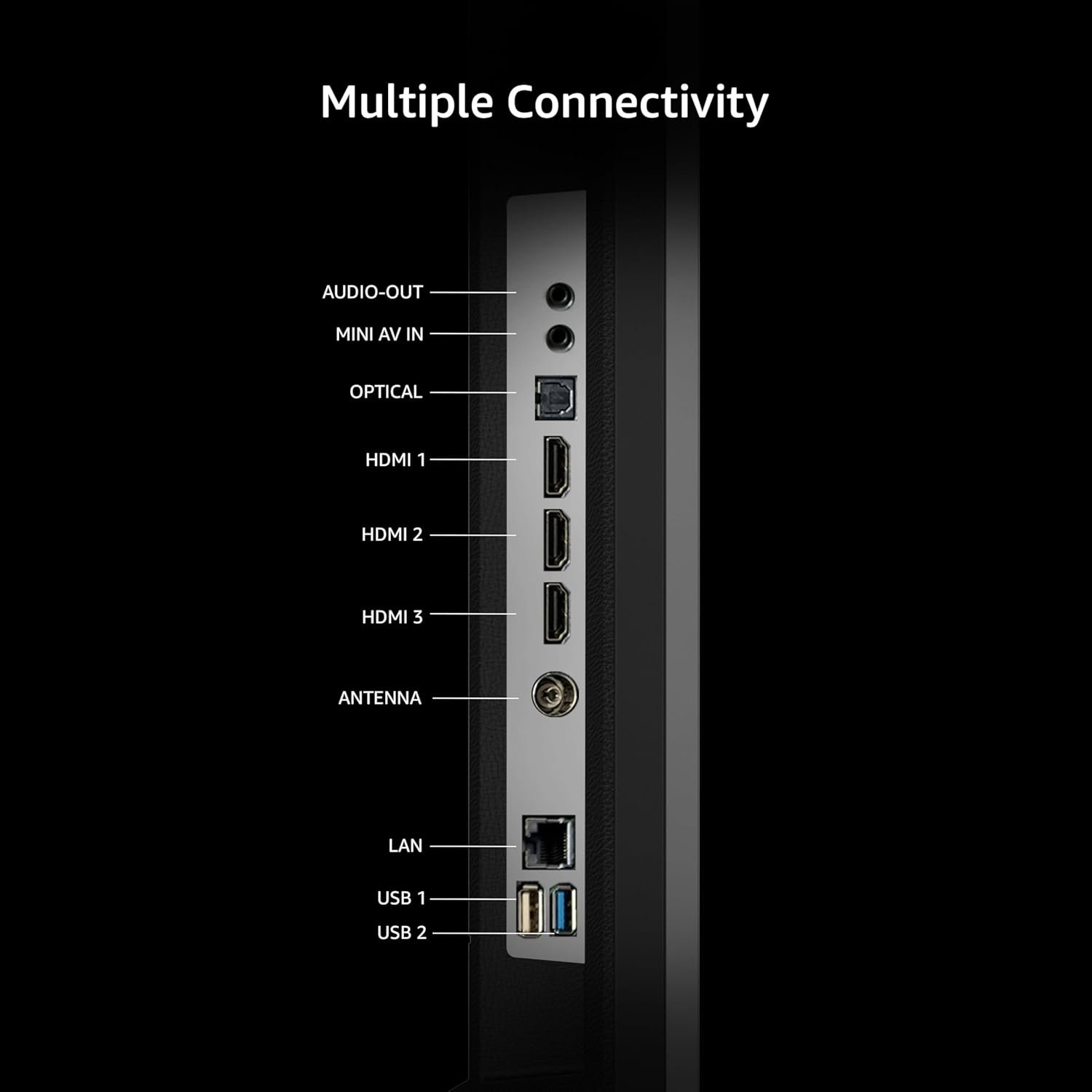 Connectivity: 2 HDMI 2.0 and 1 HDMI 2.1 ports to connect set top box, Blu Ray players, gaming console | 2 USB 2.0 ports to connect hard drives and other USB devices