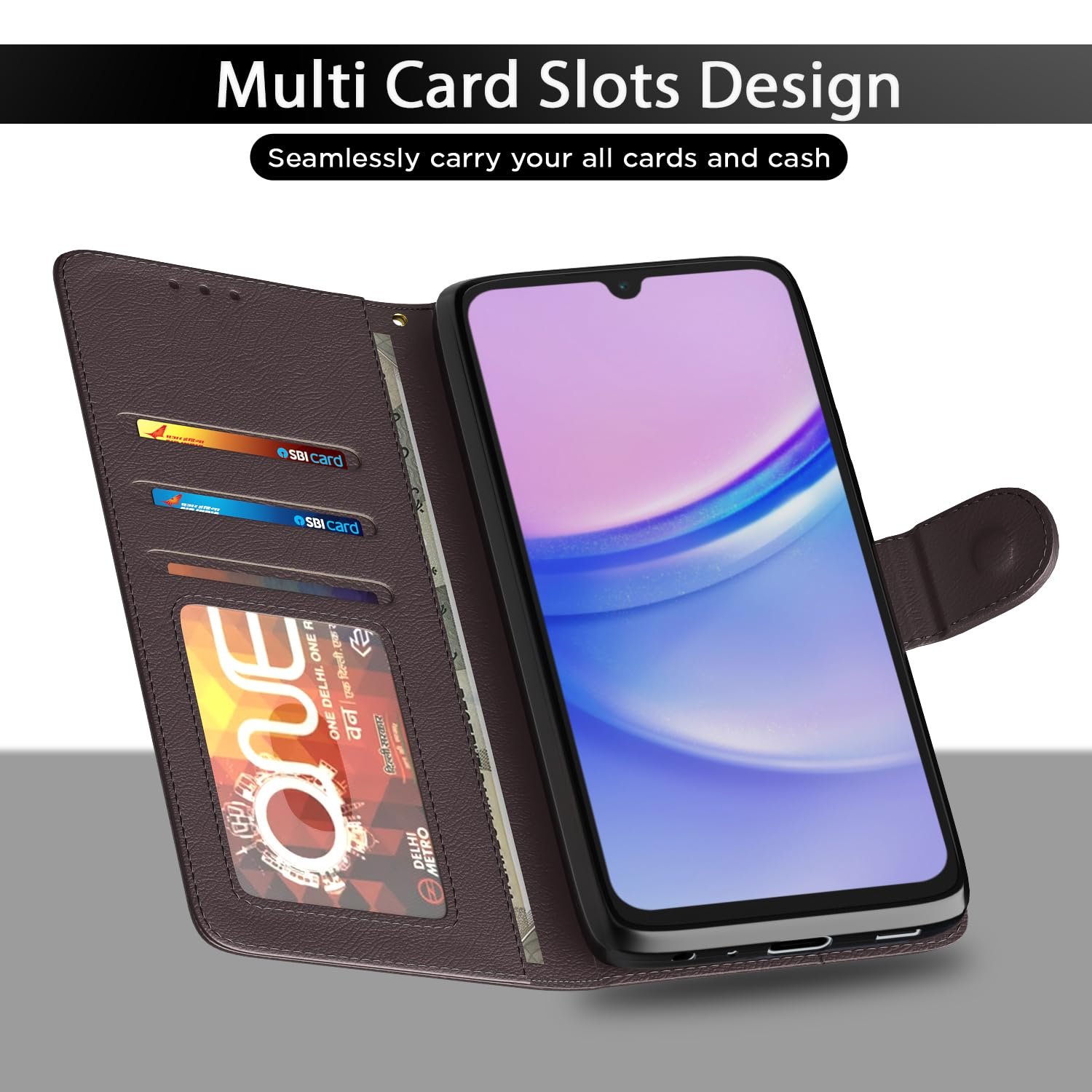 Invest in your brand new Samsung Galaxy F15 5G device’s protection today through this fit to use executive Coffee leather stand wallet case flip cover and save yourself from the heartbreak and agony of watching the scratches and damages on your device multiply periodically. This sleek executive flip cover case is designed to a perfect fit on your mobile and smooth surface further adds to its polished looks. This pouch comes with inner shell back cover that does not break easily and aids in shock absorption during impacts. This wallet case comes with card slots to store receipts, cards or emergency cash. You can now video chat or watch movies hands free in landscape mode with the wallet stand. Perfect and precise cutouts allow easy access to all ports.