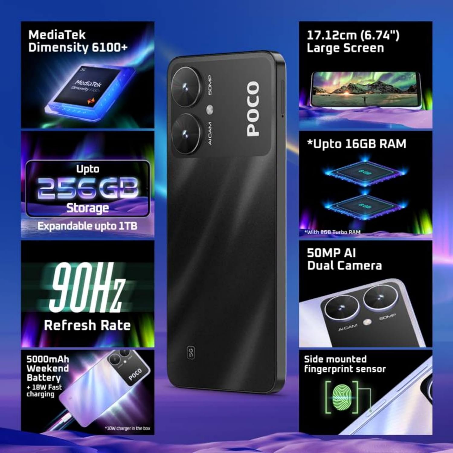 POCO M6 5G (Galactic Black,6GB RAM, 128GB Storage) | MediaTek Dimensity 6100+ 5G Processor | 5000 mAh Battery + 18W Fast Charging | 50 MP AI Dual-Camera System & Side Fingerprint Sensor