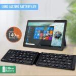 Compatible with 3 major operating systems iOS/Windows/Android Supports most Bluetooth-enabled devices.Folding design provides more convenience. Standard-size keyboard improves typing efficiency and comfort when working outdoors or traveling. Silent typing design allows you to focus more on your work.Work up to 140 hours on a single charge or standby up to 6 months with our collapsible cordless keyboard.Large keys, placed ergonomically ensures no miss-typing, no missed keys even when typing in speed. Once the work is over, fold it and put it in your pocket.Compact and lightweight makes it perfect for traveling. Take this stowaway portable fold away pocket Bluetooth keyboard on business travels or to class for note-taking, and skip lugging around a heavy laptop