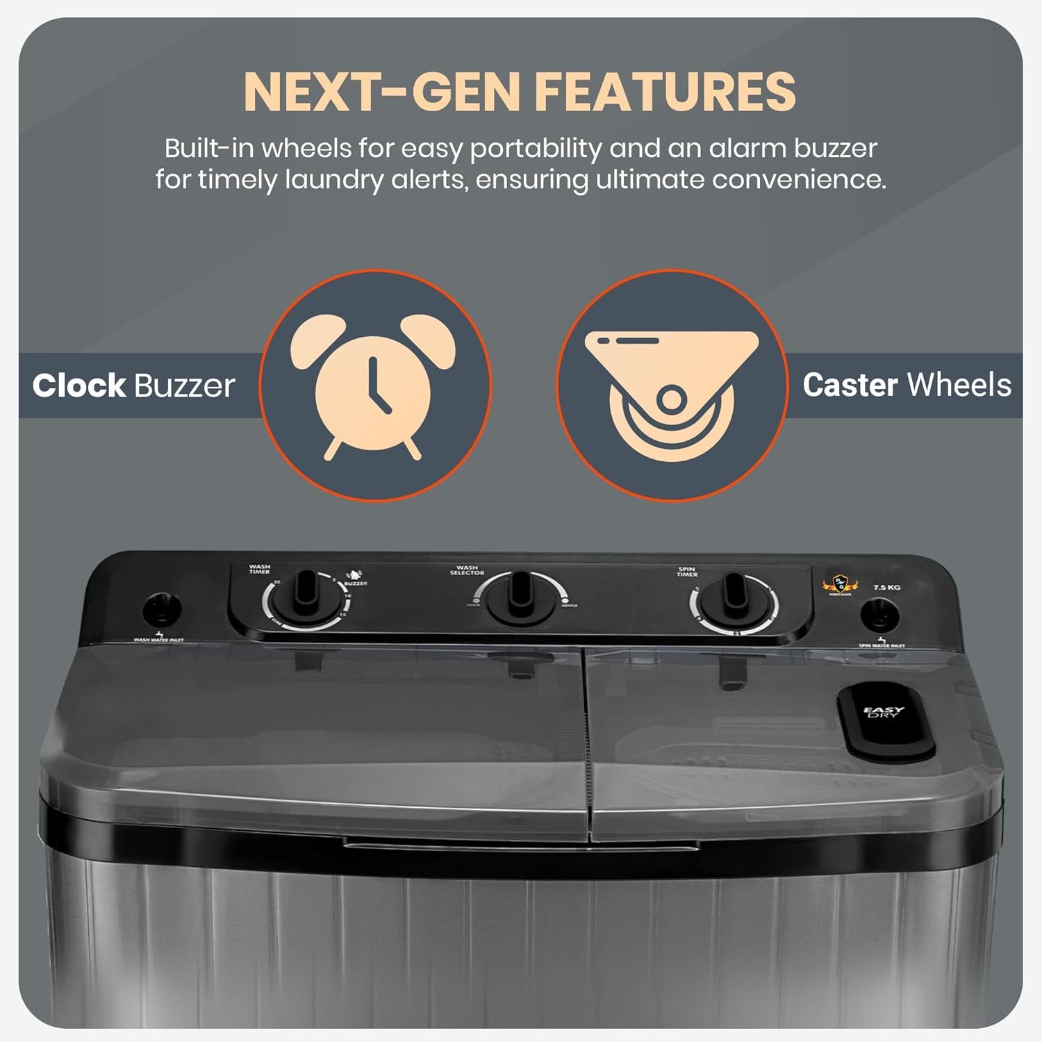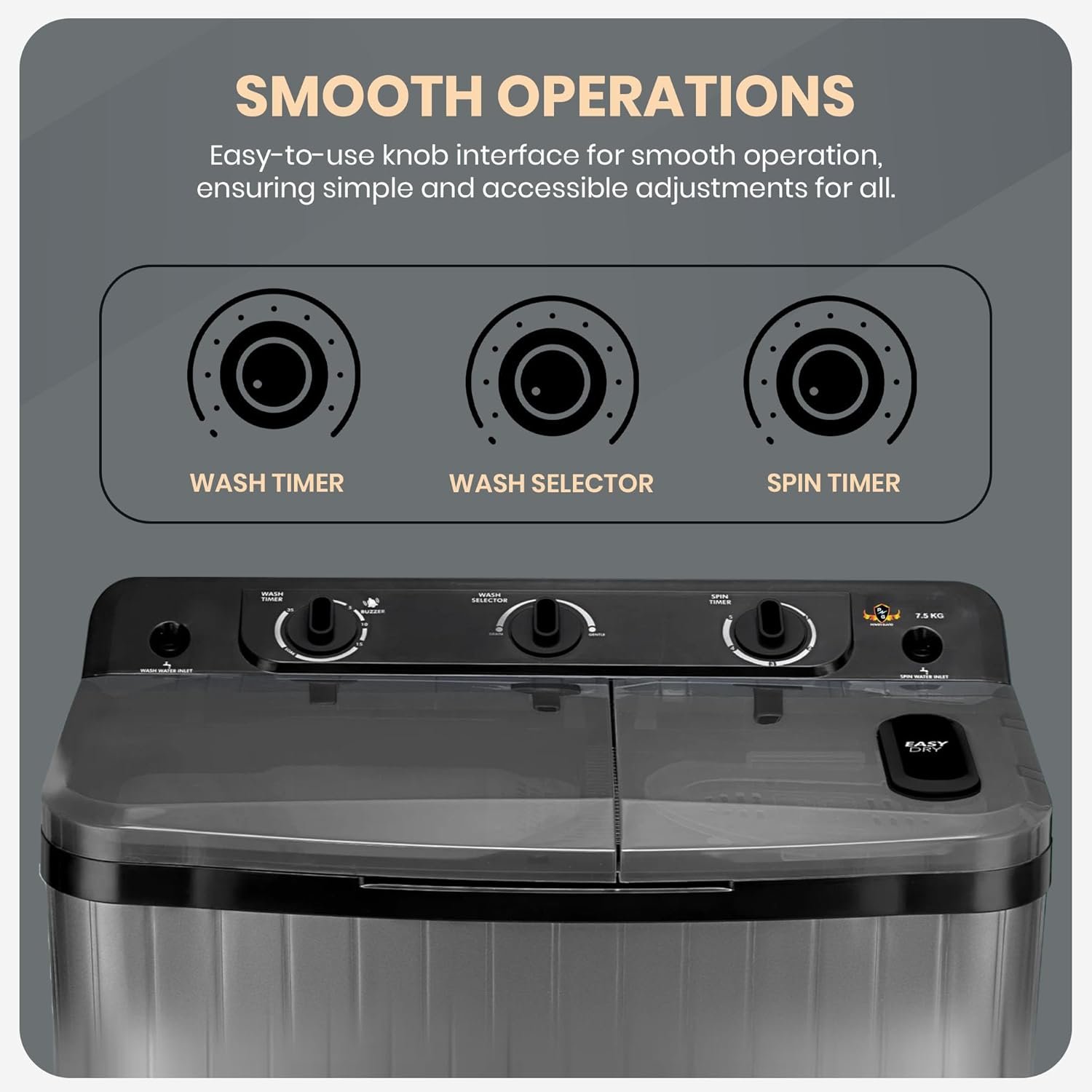 Three Mechanical Knobs + Two Wash Programs – Easy dial interface controls Delicate and Normal wash modes, along with wash/spin/drain timers.