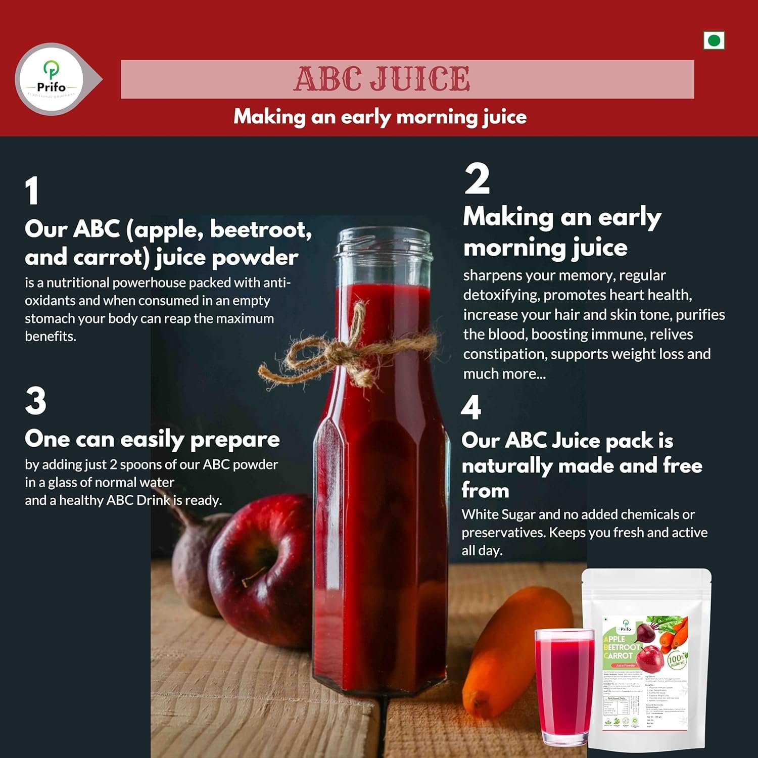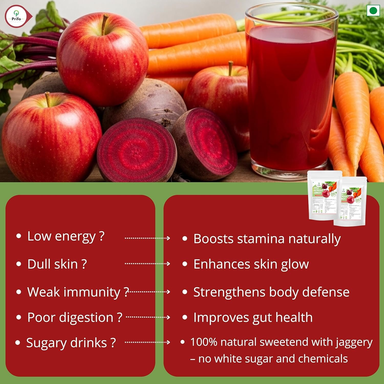 🍎 Packed with Natural Ingredients – Made using fresh apples, beetroots, and carrots with pure jaggery powder. No artificial colors, flavors, white sugar, or preservatives – just nature in a glass.