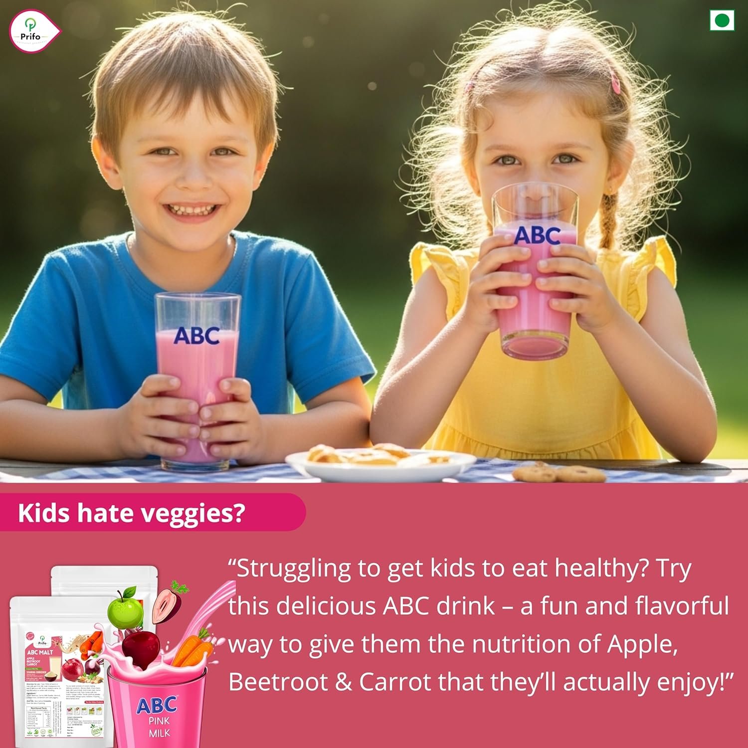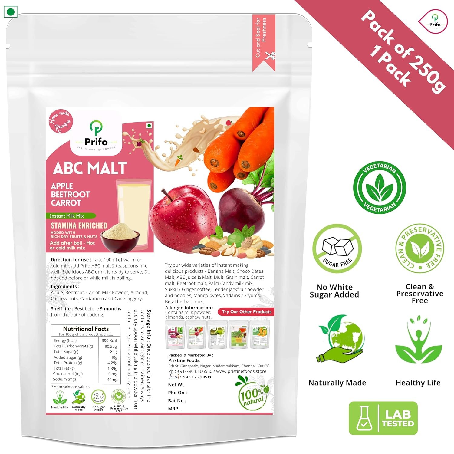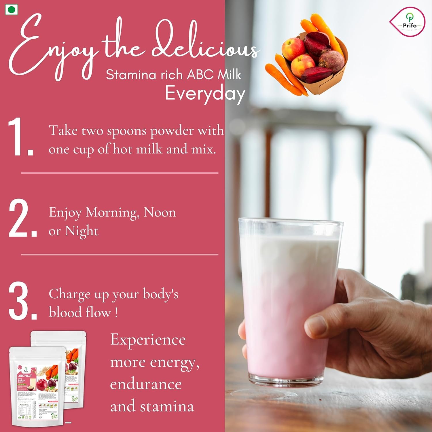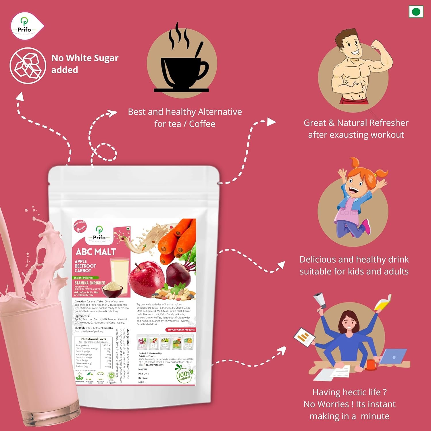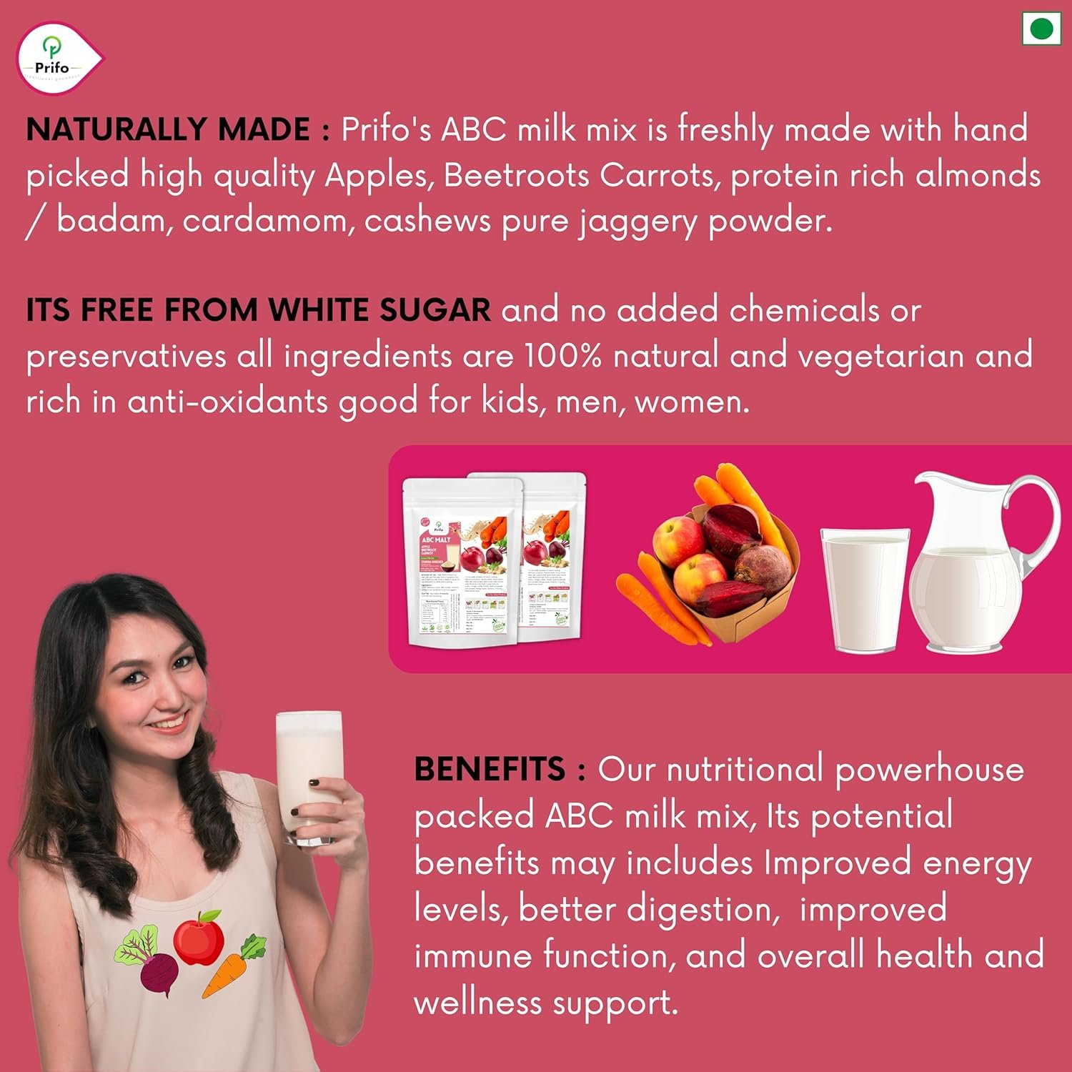 Prifo’s ABC milk mix is freshly made with hand picked high quality Apples, Beetroots Carrots, protein rich almonds / badam, cardamom, cashews pure jaggery powder.