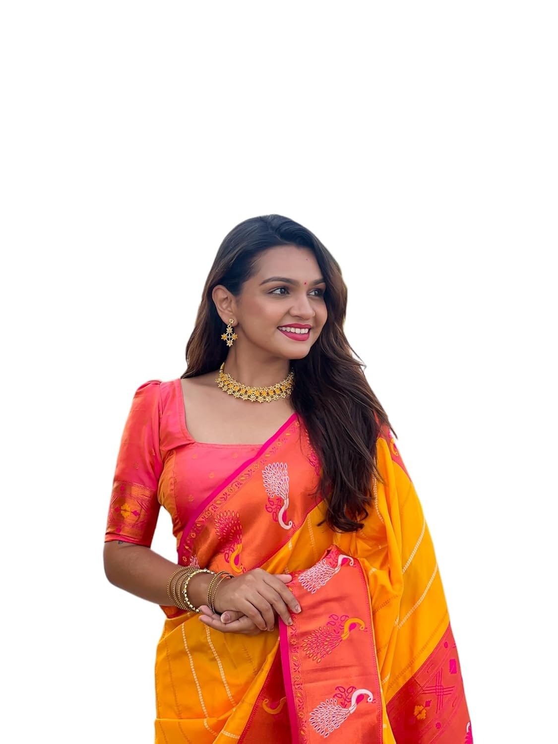 Experience the vibrant hues and intricate designs of this stunning saree from India. Crafted with utmost attention to detail, this breathtaking ensemble features a rich orange base adorned with mesmerising patterns of peacocks and paisley motifs in shades of pink and red. The delicate golden accents add a touch of elegance, while the tasselled borders lend a traditional charm. Drape yourself in this exquisite saree and embrace the captivating allure of Indian heritage. Suitable for festive occasions or formal events, this saree is a true celebration of artistry and cultural splendour. Please note that hand washing is recommended to preserve the vibrancy of the colours and intricate embroidery.