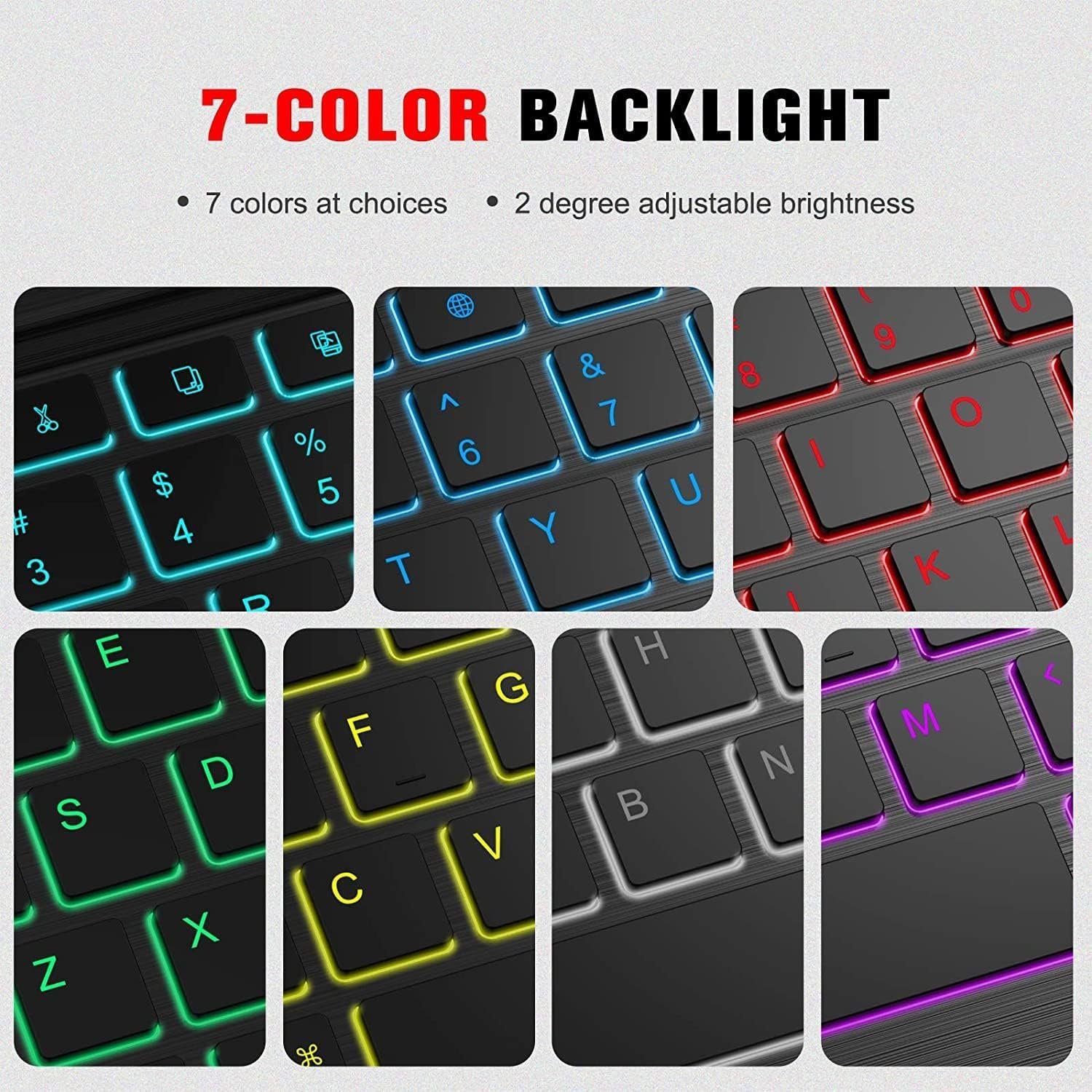 ✔【Detachable Wireless TouchPad Keyboard with Rainbow Backlit】7 colors rainbow back-light make typing fun and easy in the dark/night. The Bluetooth connection is stable and mechanical scissor keys are quiet with rebound feature. With the U.S Chipset, helping you to type stable and fast. Rechargeable battery make keyboard can work wireless for longer time, provide the freedom to read or work anywhere at any time