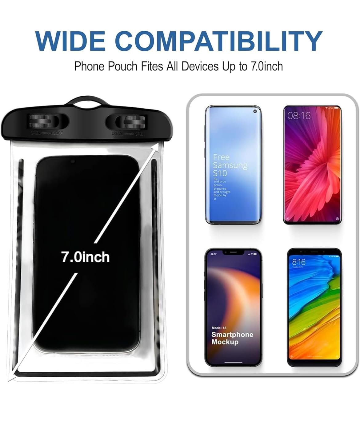 Universal Compatibility: Phone waterproof cover fits most smartphones up to 7 inches, including iPhones, Samsung Galaxy, and other popular brands and waterproof mobile pouch accommodating small essentials like cash, credit cards, and keys for convenience.