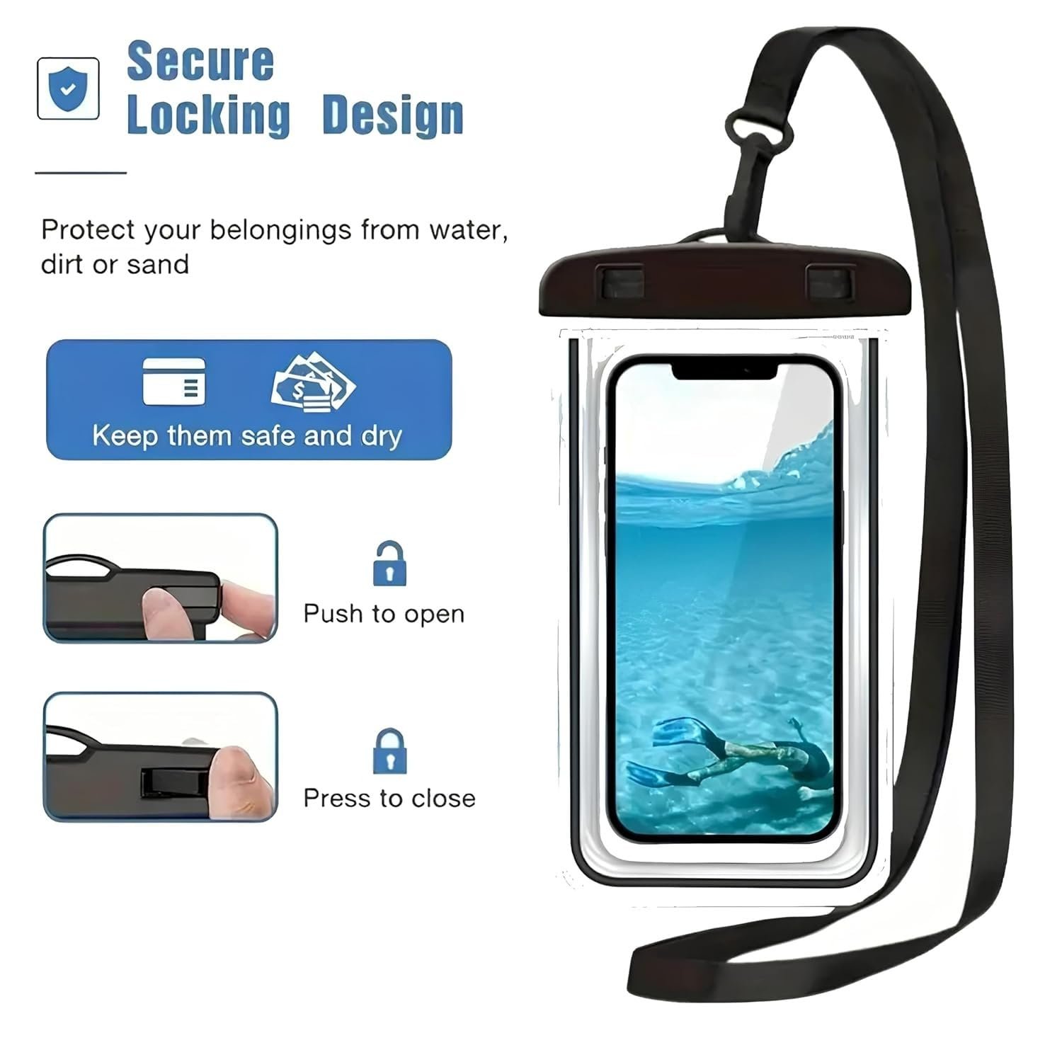 Durable & Secure Locking Mechanism: Waterproof phone case equipped with a reinforced dual-locking system, including a snap-and-lock seal and airtight closure, ensuring that water, dust, and dirt stay out, even in extreme condition.