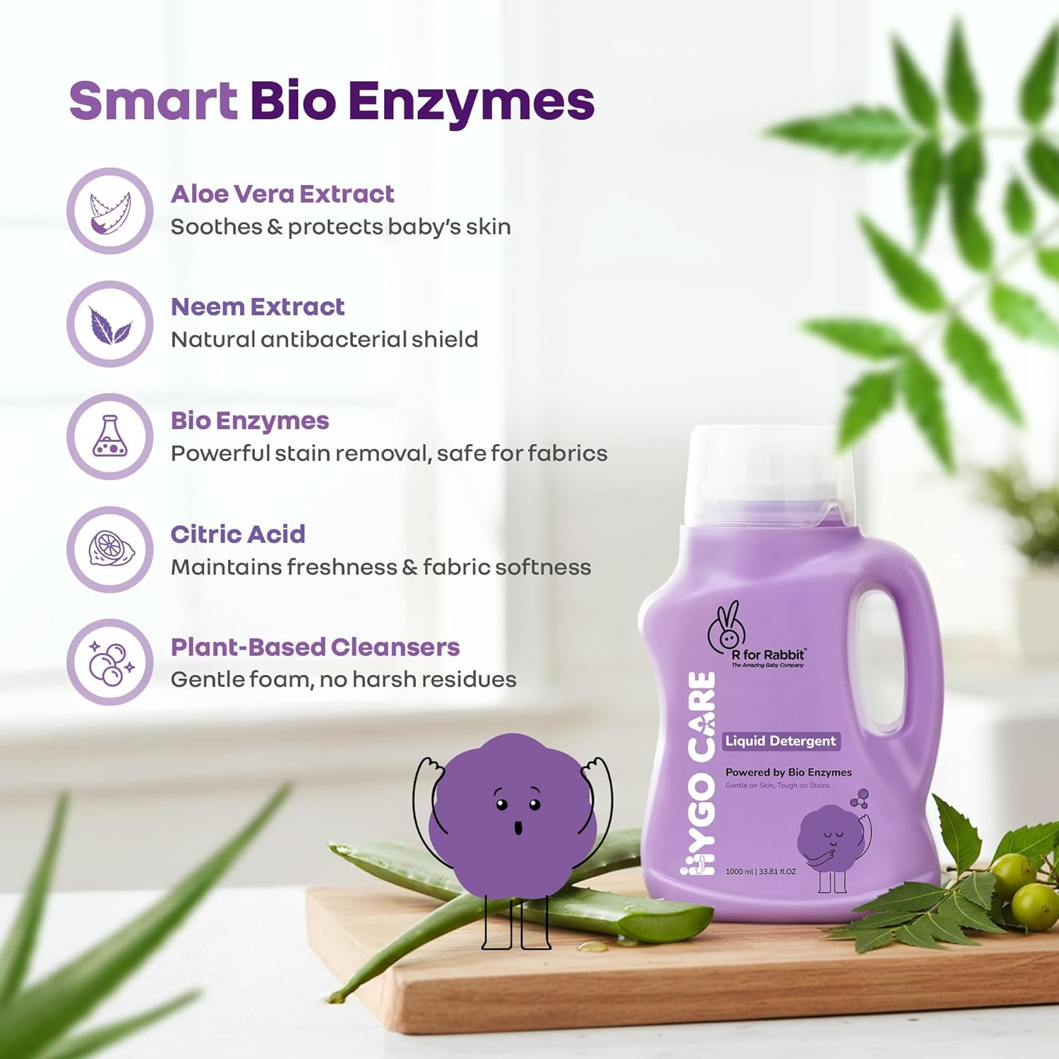 R for Rabbit Hygocare 1000ml Baby Laundry Liquid Detergent for Clothes Powered by Bio Enzyme Handwash & Machine Wash, Effective Stain Removal, Residue-Free Biodegradable