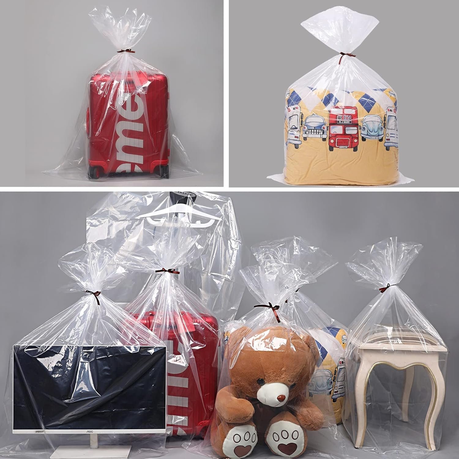 Large Capacity: Extra large Trolley luggage storage bags ,40×60 inches in size. Extra large plastic storage bags are very convenient to store kinds of furniture or some unused goods . Strong and Reliable: 2 mils thick extra large clear plastic bags are sturdy and long-lasting. Will not rip or tear easily when you pack your Travel , luggage , trolley , cabin bags . Keep Dirt Away: The large storage bag is made from reliable material, suitable for daily use. Our huge plastic bags for storage will keep the dirt out . Clear: With the clear design, you can look through luggage from these big storage bags, which will see exactly what’s inside. Wide Range of Uses: These large plastic storage bags are suitable for packing items such as cushions, window curtains, plush toys, clothes, pillows, duvets, and comforters. Even your queen-size quilt or blanket will fit snugly in these jumbo bags
