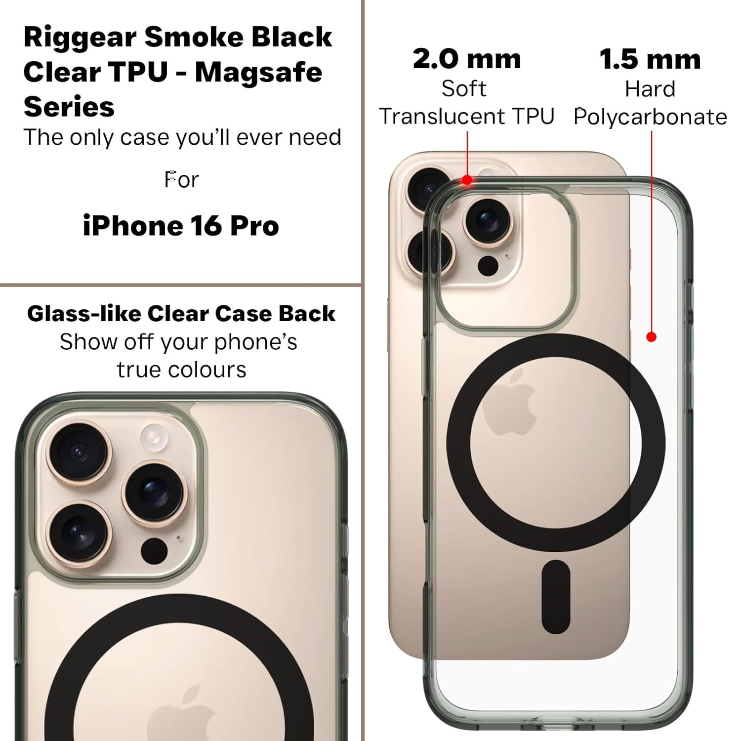 RIGGEAR Shockproof Clear Hybrid Armor Compatible with MagSafe Accessories for iPhone 16 Pro Case, iPhone 16 Pro Back Cover (Smoke Black Clear TPU Bumper + Crystal Clear PC)
