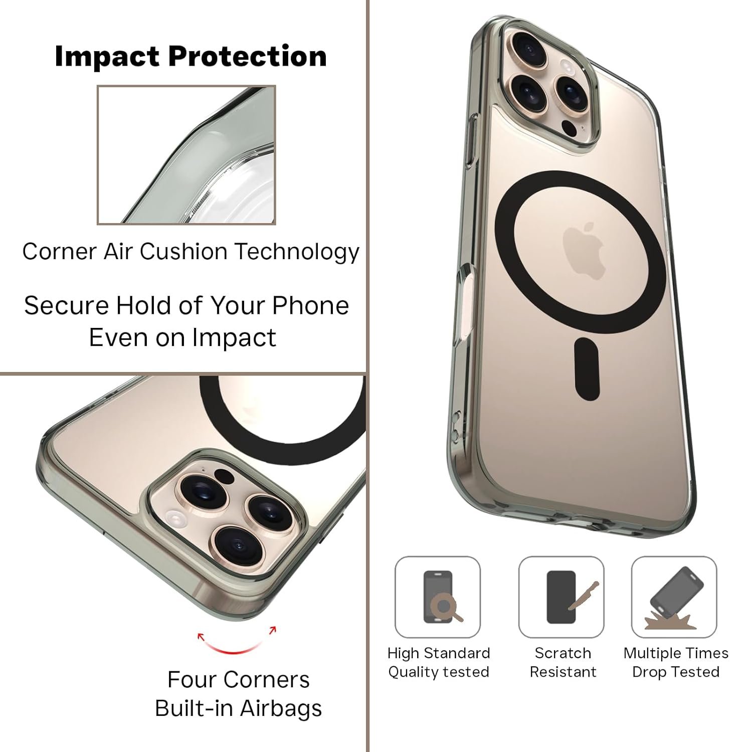The must-have case for the customers who love to flaunt the looks of their phone. The transparent back of Phone Case and Smoke Black Clear TPU bumper hybrid construction provides good protection because of soft shock-resistant TPU and corner shockproof airbags. The clear PC on the back helps showcase true color of the phone. We have kept the cost under check and have used the best possible materials in making this case thus making it the best phone case/ cover you can buy at best price. The case being compatible with MagSafe accessories is an added advantage.