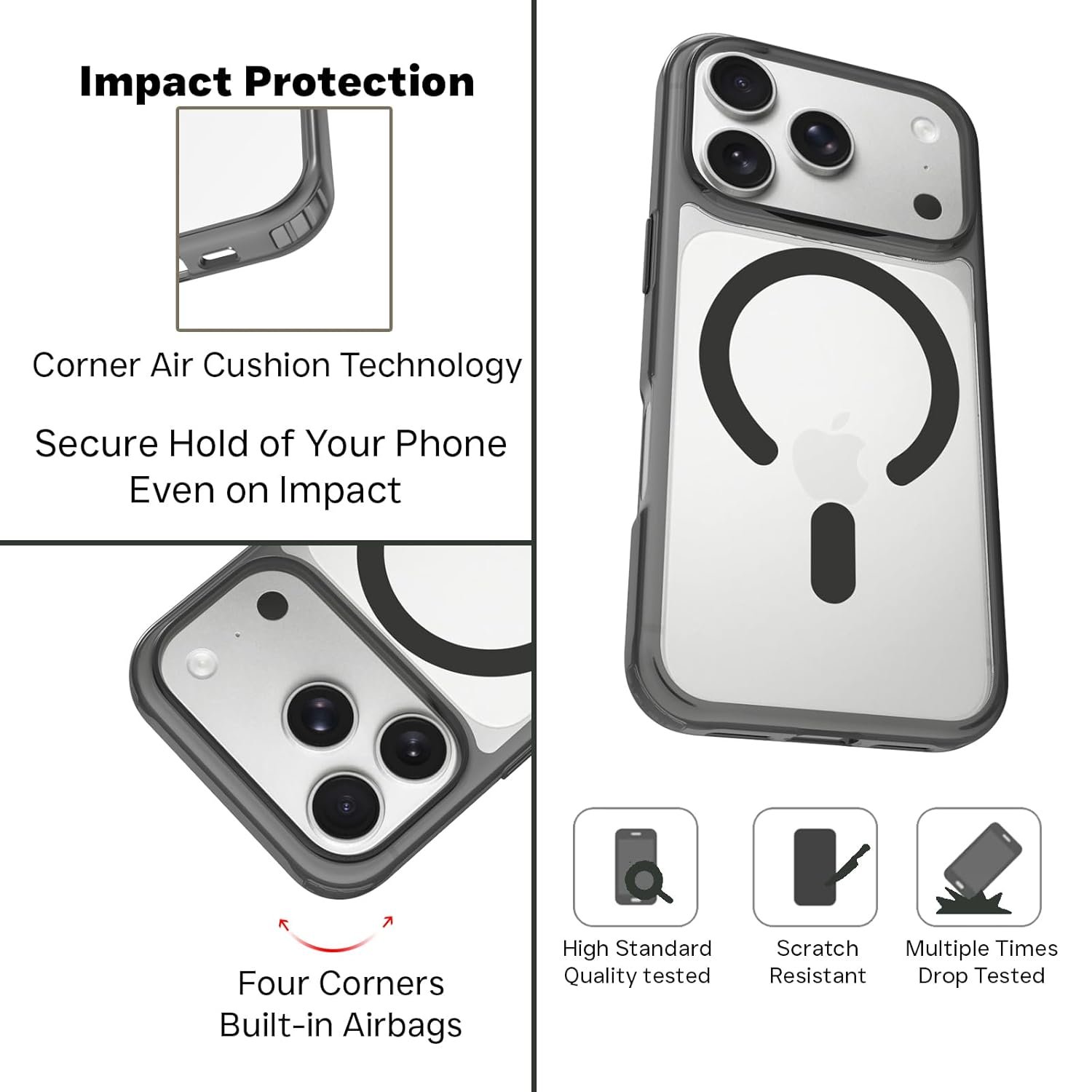 The RIGGEAR Shockproof Clear Hybrid Armor MagSafe Series Cases and Back Covers are for those who love to flaunt the looks of their phone. The transparent phone case and clear TPU bumper hybrid construction provide good protection because of soft shock-resistant TPU and corner shockproof airbags. We have kept the cost under check and have used the best possible materials in making this case, thus making it the best phone case/cover you can buy at the best price. The case being compatible with MagSafe accessories is an added advantage. For iPHONE 17 PRO MAX