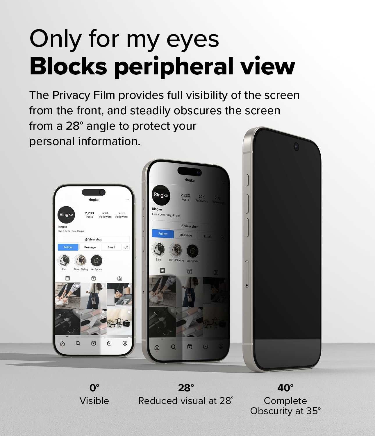Polarizing privacy filter reduces the screen’s visibility at 28? and completely obscures it at 40°.