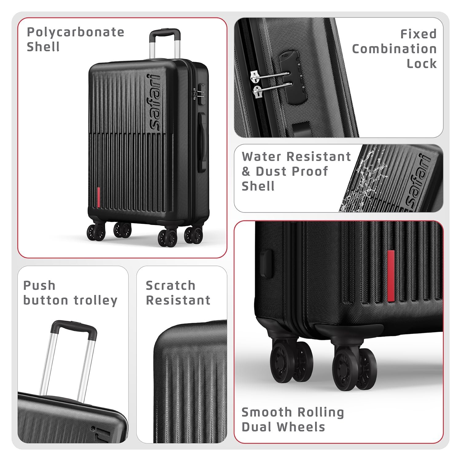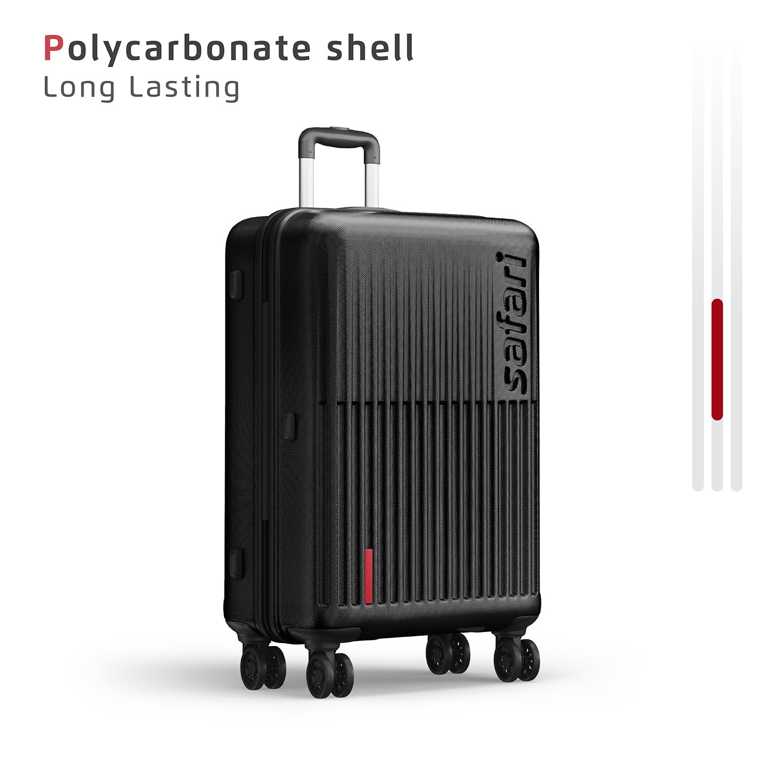 Textured Scratch resistant Polycarbonate shell. The material makes the luggage lightweight yet strong