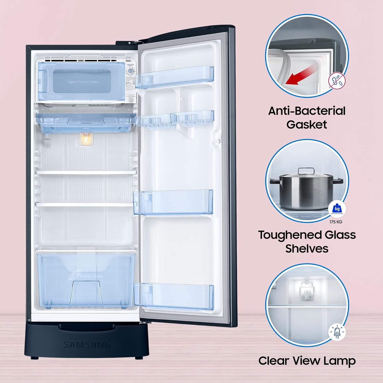 Interior Description : Fresh Food Capacity : 165 Ltr | Freezer Capacity : 18 Ltr | Total no. of compartments : 1 | Shelves : 2 | Vegetable Drawers : 1 | Shelf Type : Toughened Glass Shelves | Anti Bacterial Gasket | Base stand with Drawer for additional space for non-refrigerated food items