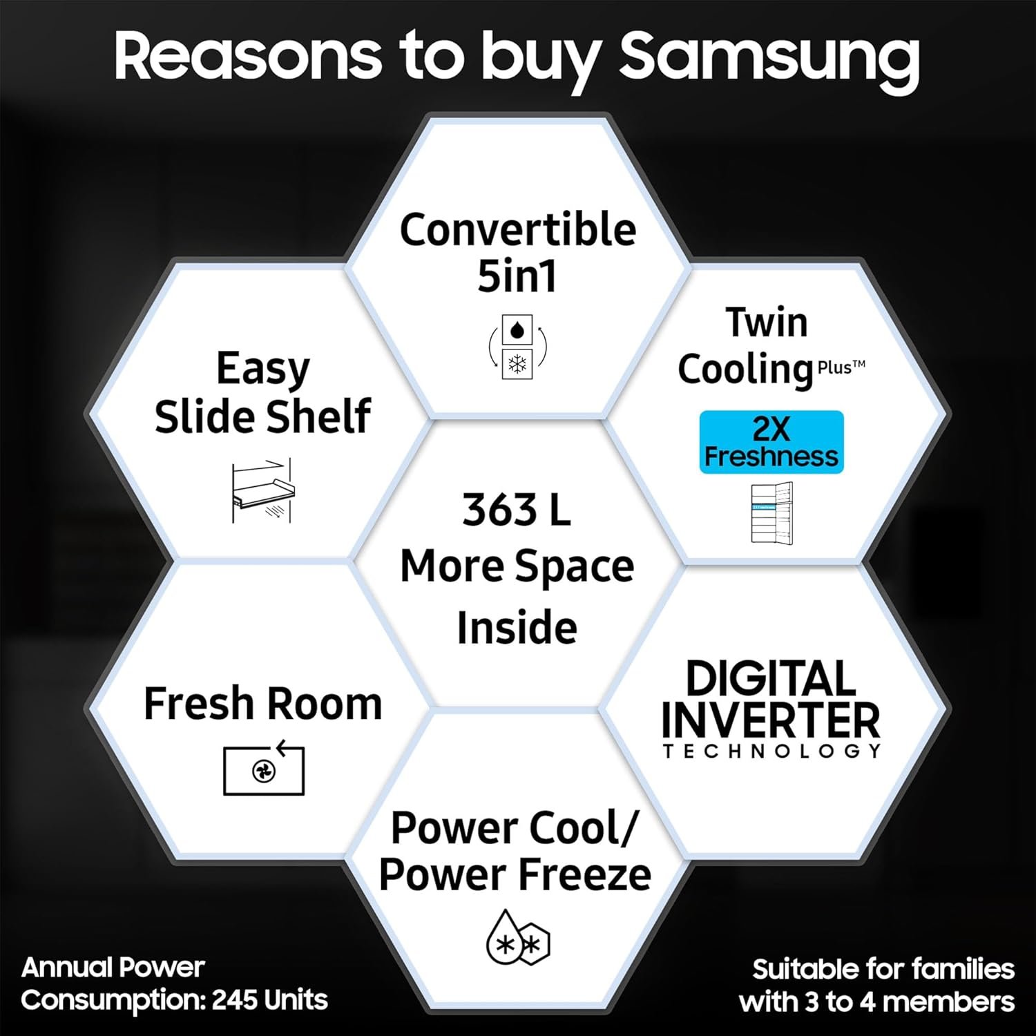 Special Features : Twin Cooling Plus | Convertible 5-in-1 | Digital Display | Power Freeze | Power Cool | Coolpack | Fresh room