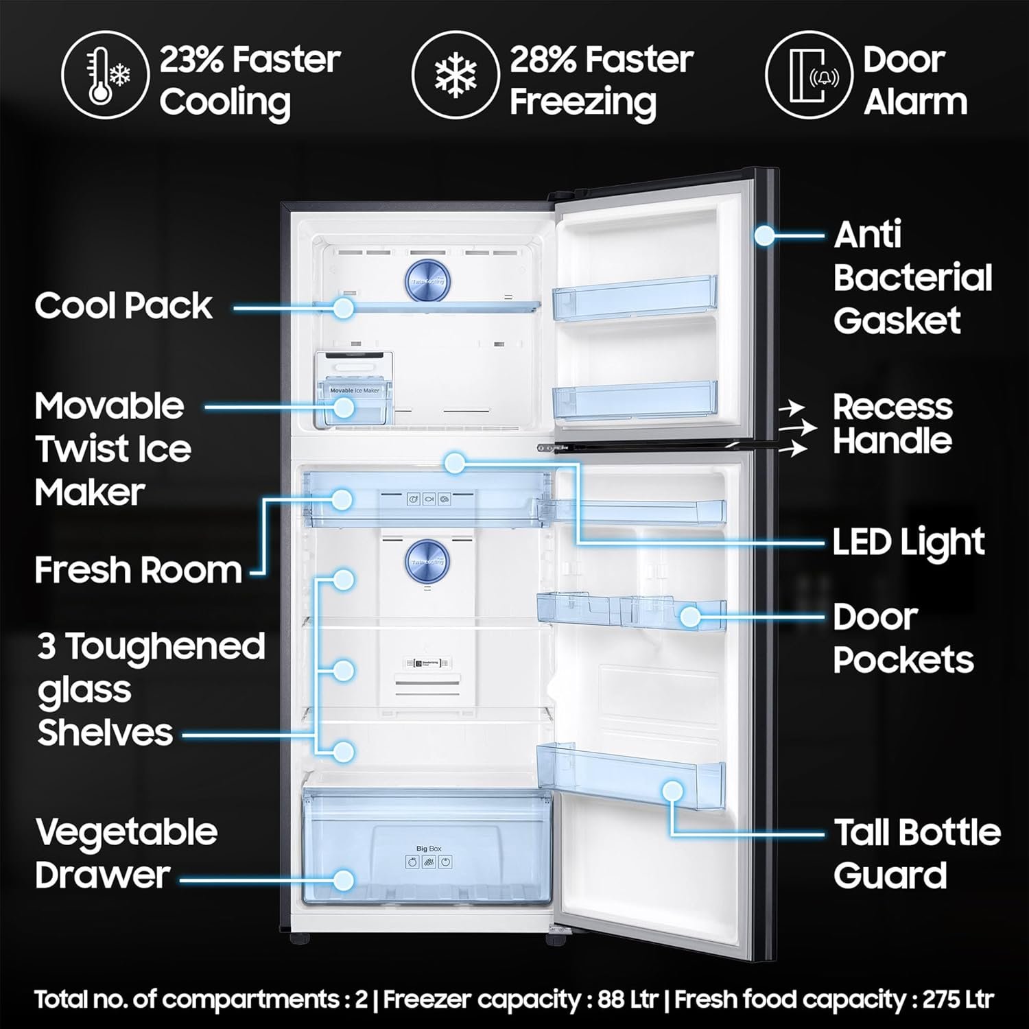 Interior Description : Fresh Food Capacity : 275 Ltr | Freezer Capacity : 88 Ltr | Total no. of compartments : 2 | Shelves : 2 | Vegetable Drawers : 1 | Shelf Type : Toughened Glass Shelves | Anti Bacterial Gasket |