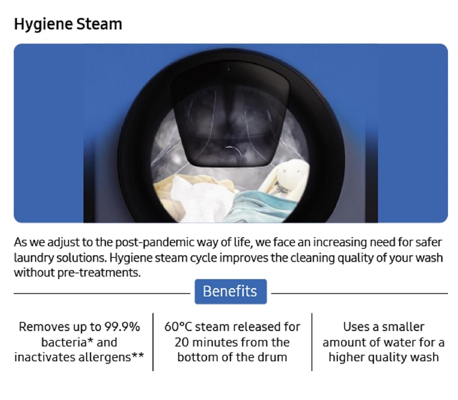 Wash Programs: 20 Wash Programs – 15′ Quick Wash| Hygiene Steam – Removes 99.9% germs and allergens | Drum Clean – Removes dirt and 99.9% of odor-causing bacteria | Activewear| Baby Care| Bedding| Cloudy Day| Colors| Cotton| Daily Wash| Delicates – Gentle wash for delicate clothes| Drain/Spin| E Cotton| Jeans| Outdoor| Rinse + Spin| Shirts| Silent Wash| Synthetics| Towels| Wool