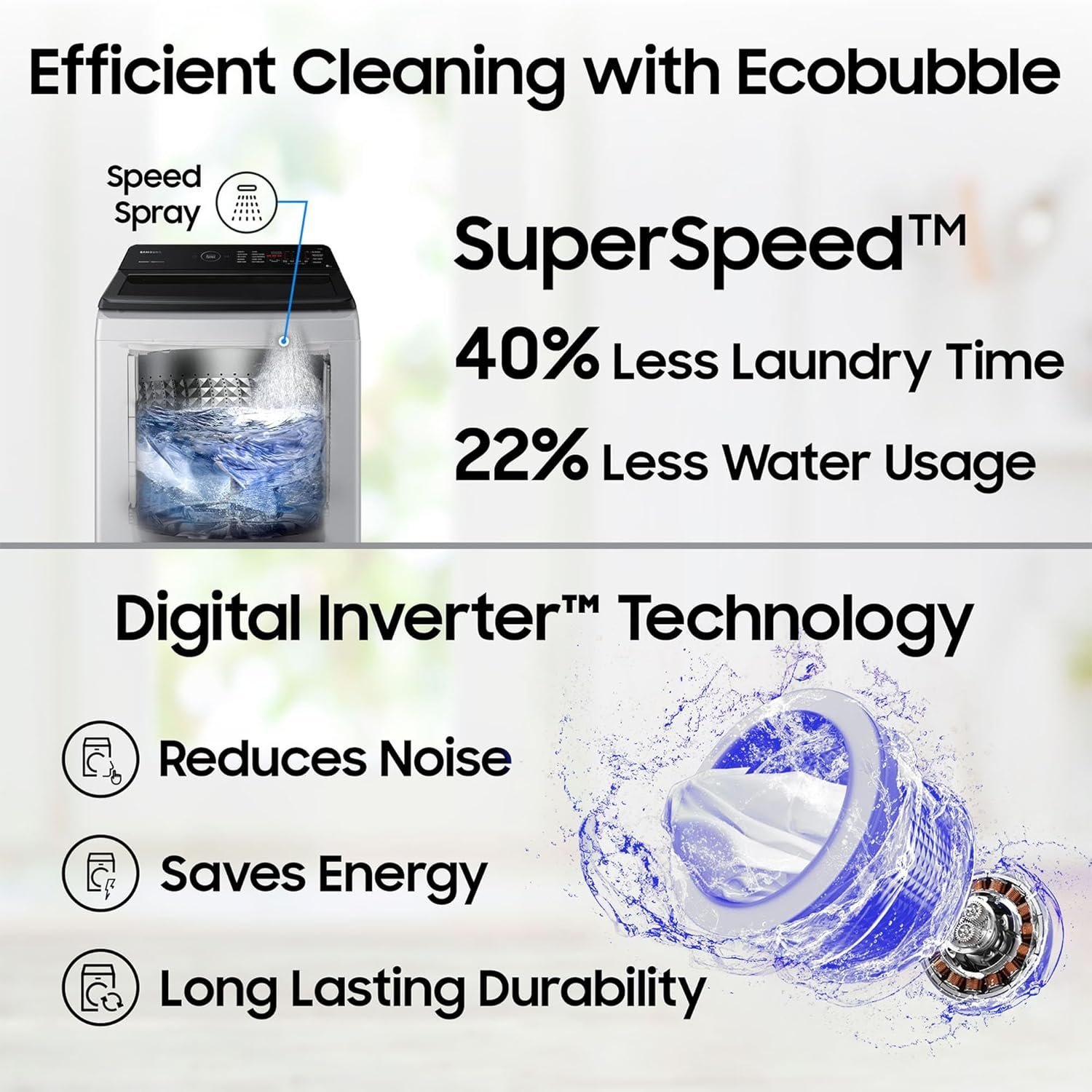Wash Programs: 11 Wash Programs – Quick Wash Aqua Preserve Baby Care Bedding Delicates Eco Tub Clean Energy Saving Jeans Normal Rinse + Spin Bubble Storm Intensive Wash Super Speed Power Tub Clean Delay End