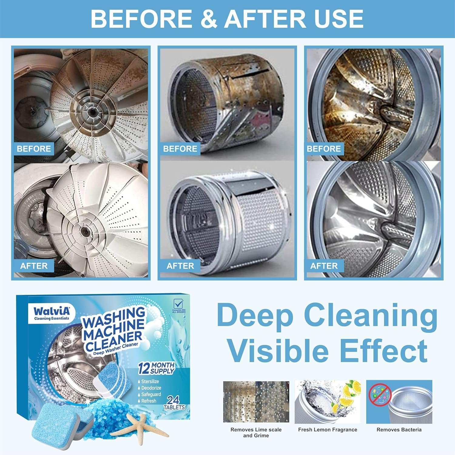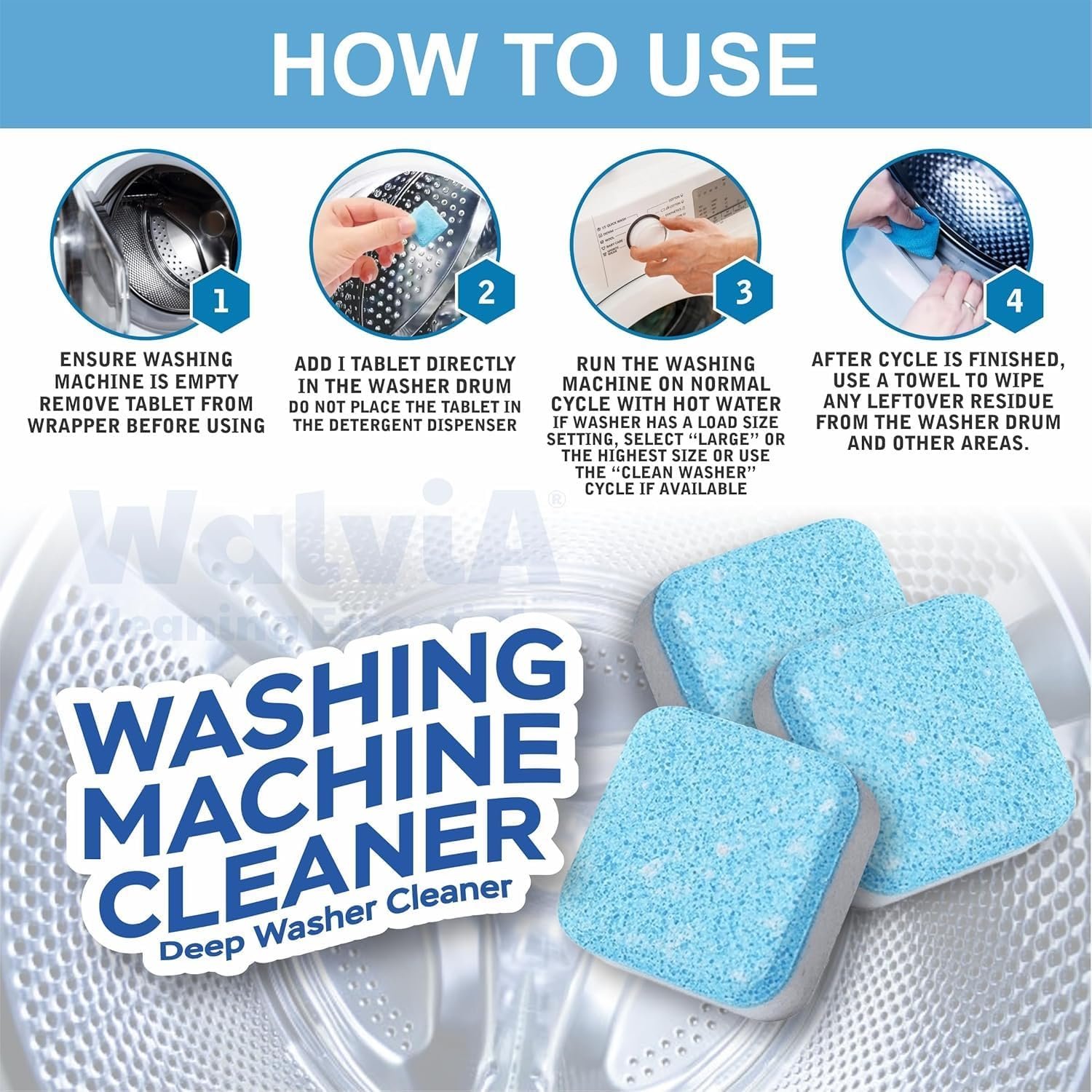 Instant Cleaning Power – Walvia Self Wash Tablet Cleans So You Don’t Have To Brush And Wipe Your Washing Machines. When Exposed To Water, They Break Down Into Deep Scrubbing Powder Cleaners That Breaks Down Grime And Hard Water Build Up