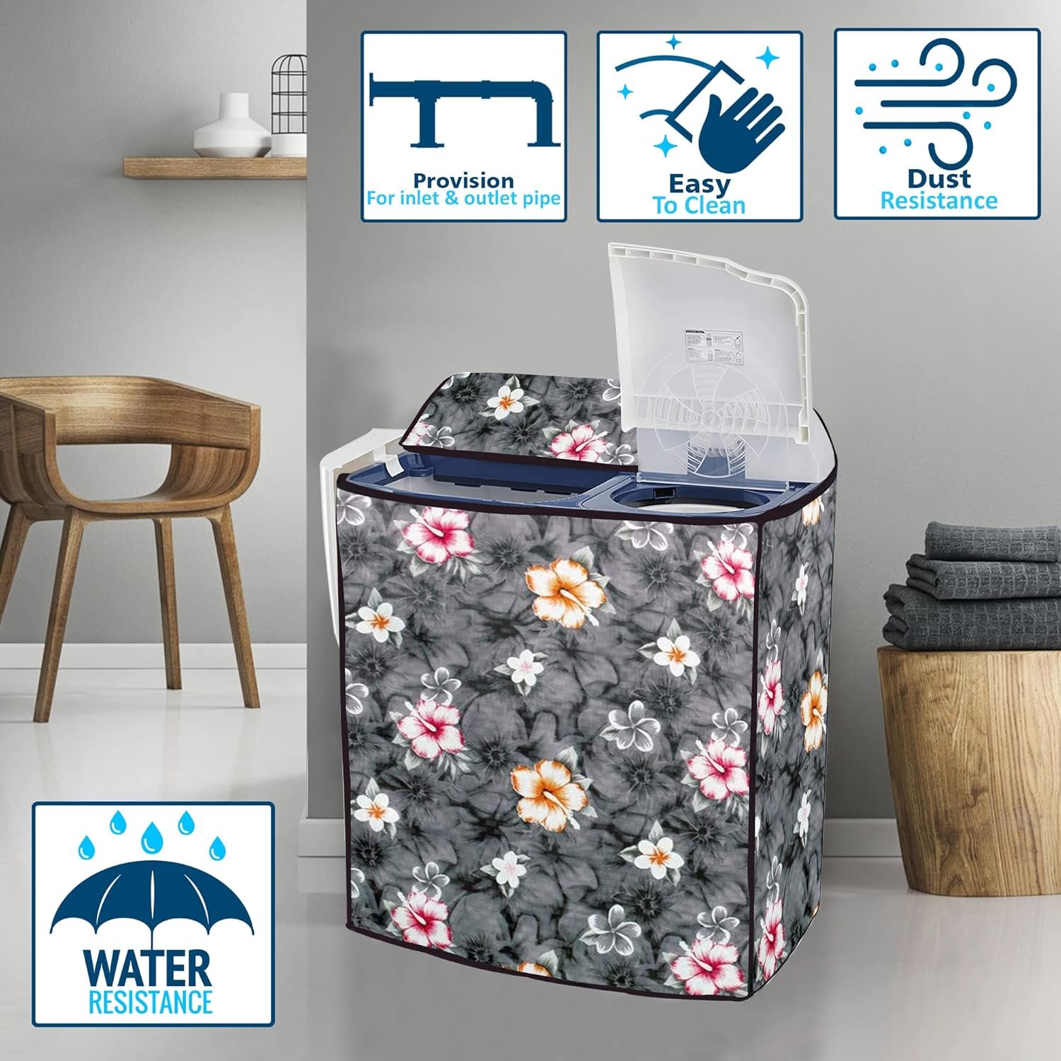 Waterproof and Dustproof. Holes provided for Inlet Pipe, Outlet pipe and Power Cord. It helps you to keep your washing machine safe from scratches, stain, dust and other particles