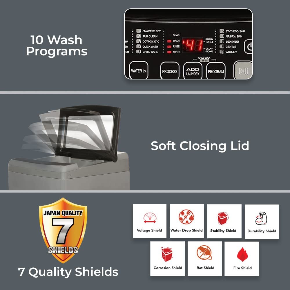 Wash Programs : 10 Wash Programs – Smart Select, Tub Clean, Cotton 30°C, Quick Wash, Child Care, Synthetic/Saree, Air Dry, Bed Sheet, Gentle, Woollen | Panel – Touch panel & Digital display