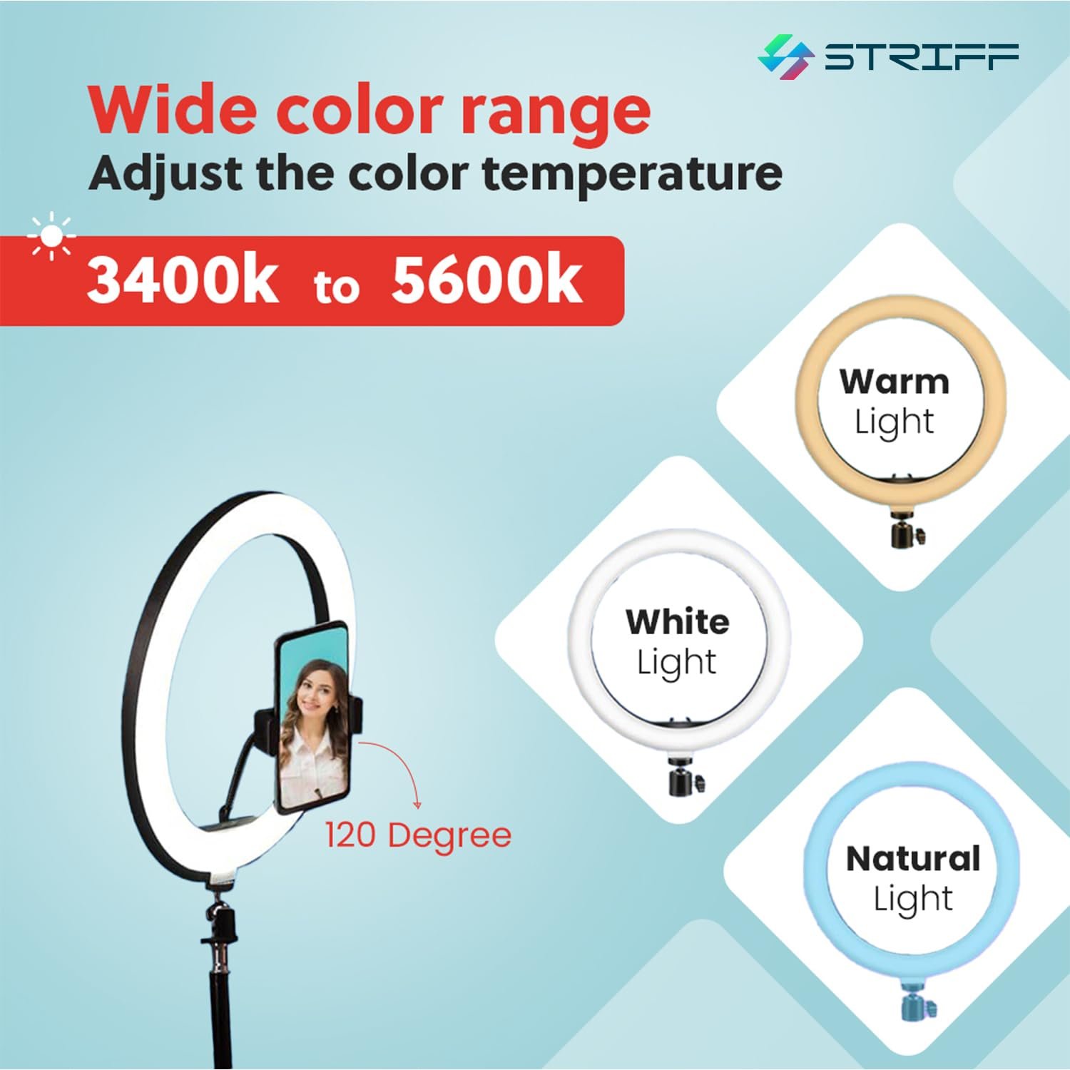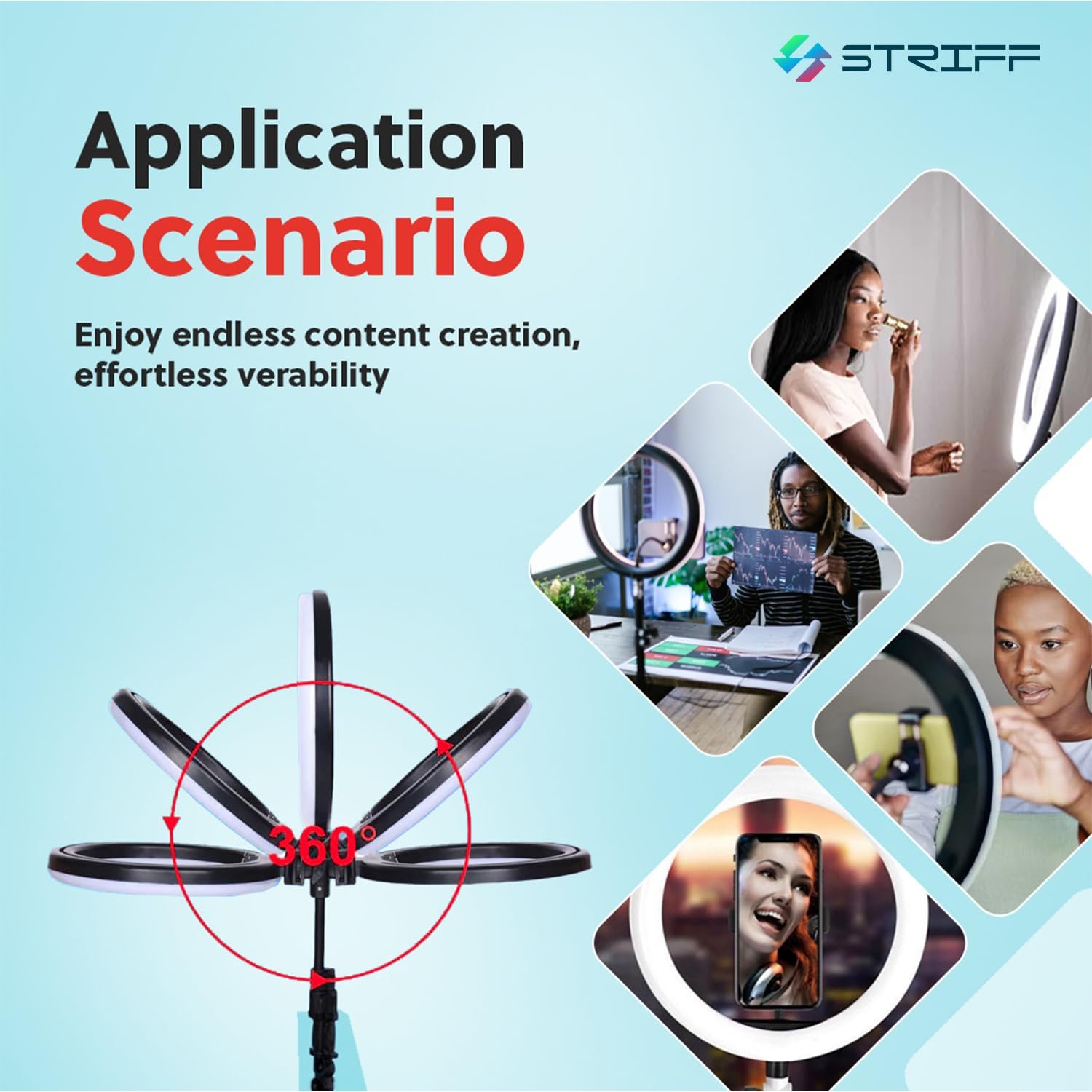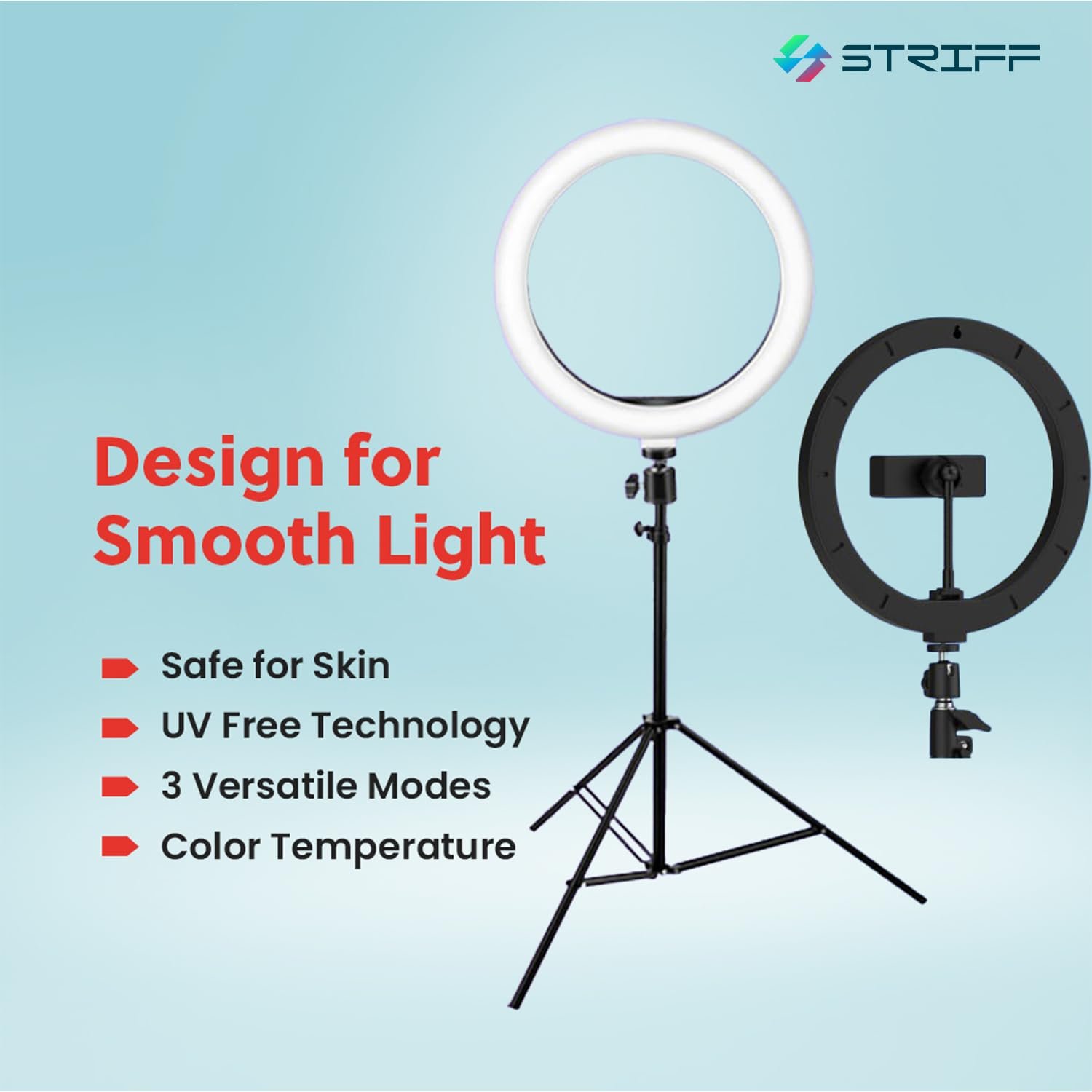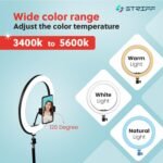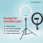 · Phone Holder And 7 Feet Tripod Stand – Striff Ring Light has a rotating (360 degrees) phone holder and a retractable tripod that effortlessly helps you capture different levels of brightness and angles of lighting!.