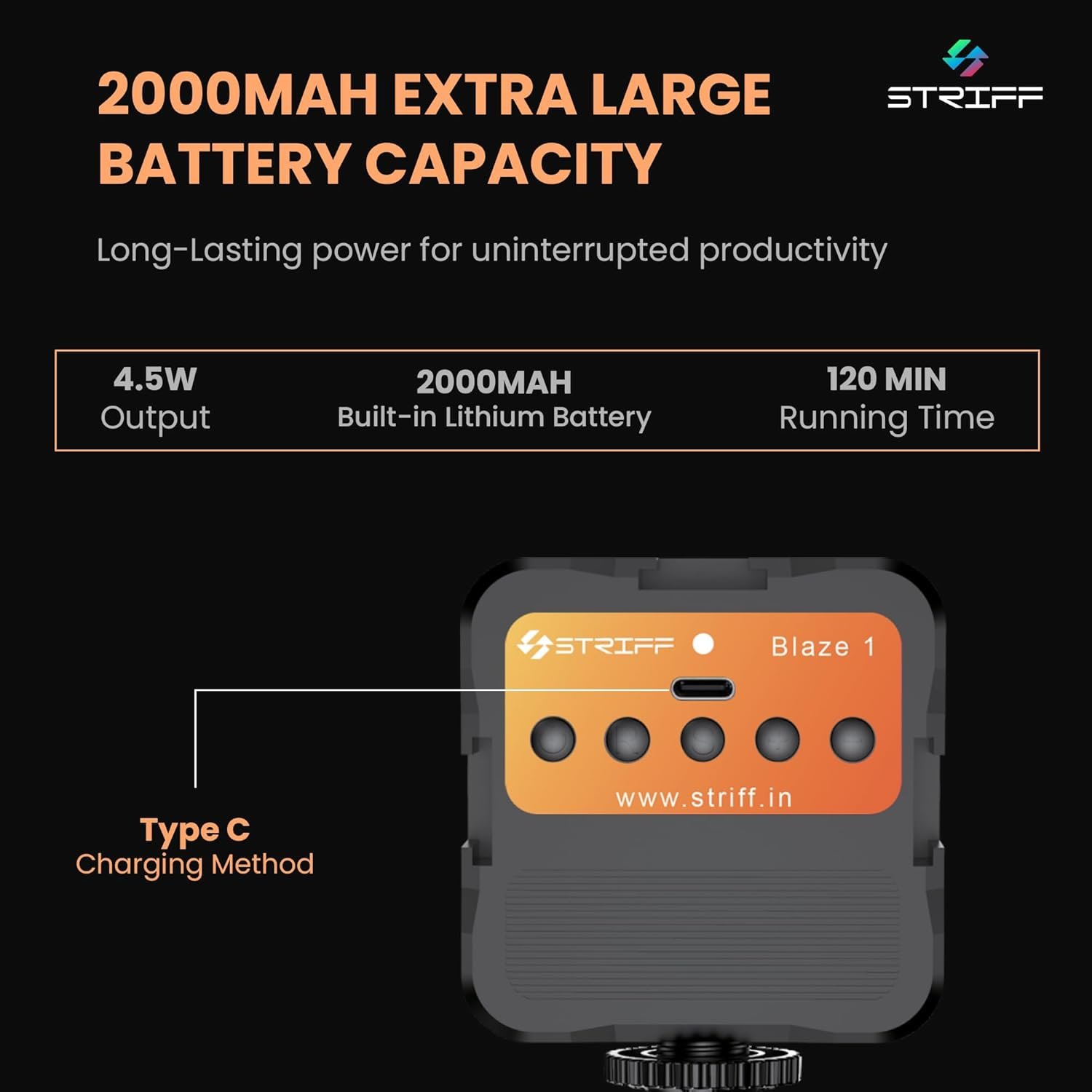 Portable with Long Battery Life: Powered by a built-in 2000mAh rechargeable battery, it provides extended usage time. Weighing only 119g, it is lightweight and easy to carry, making it a convenient lighting solution for on-the-go applications