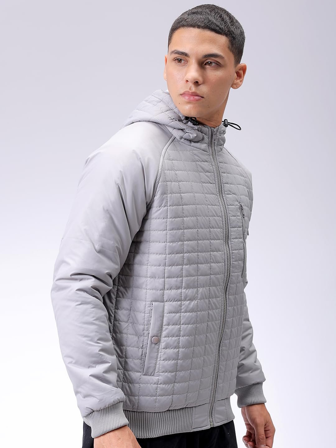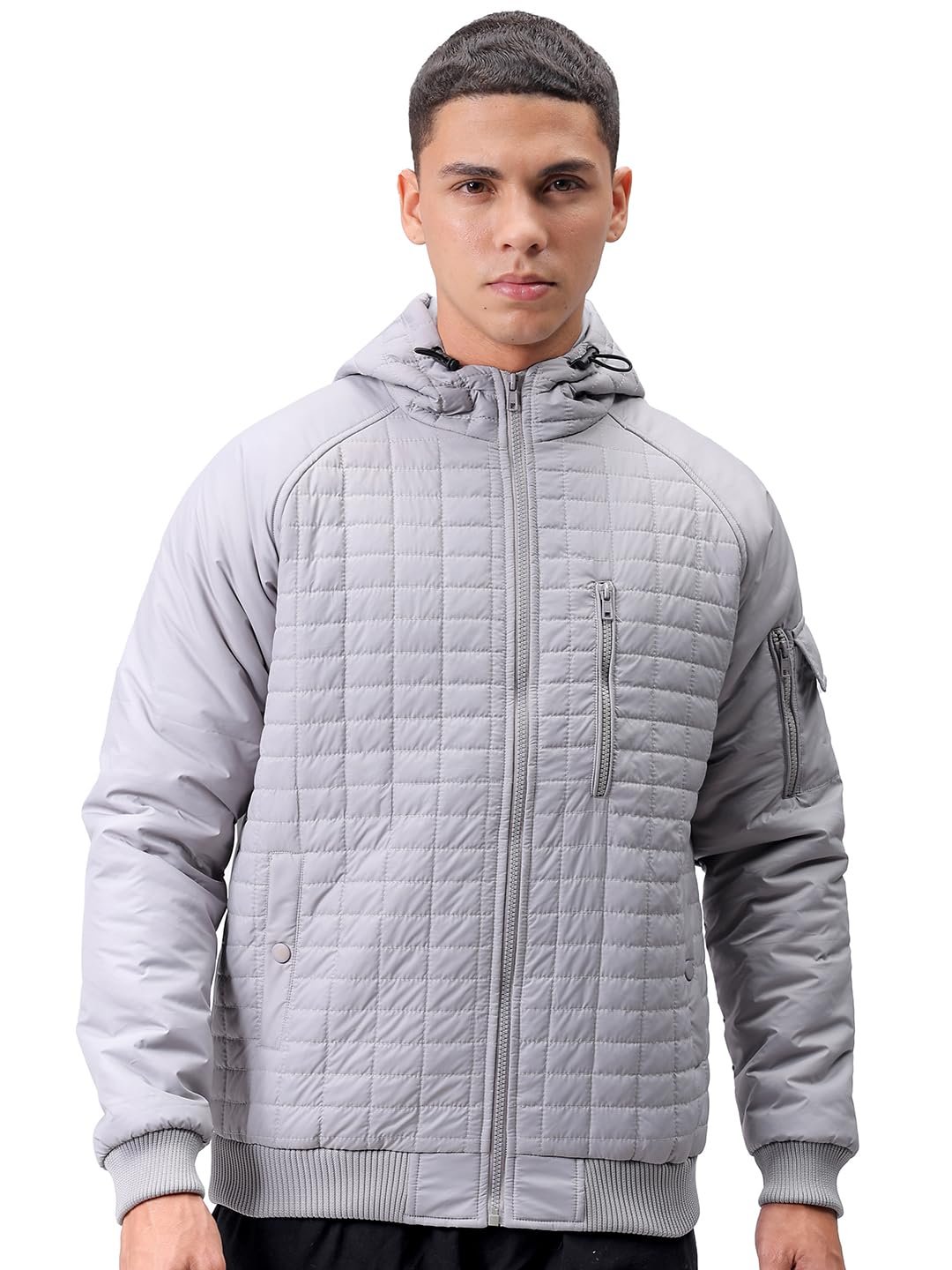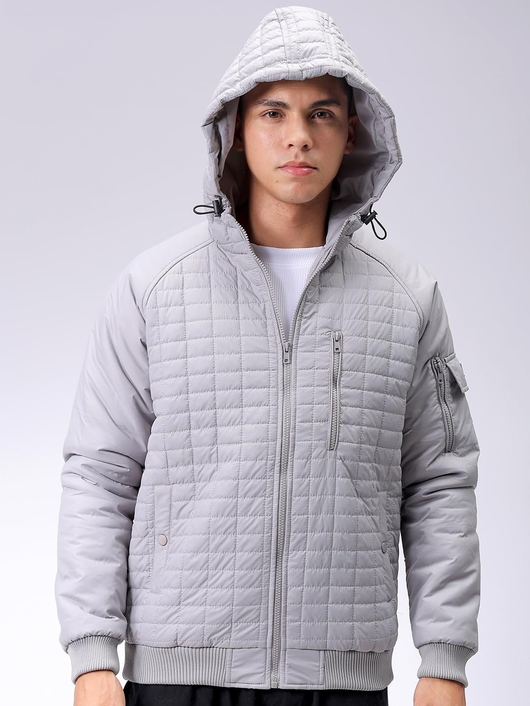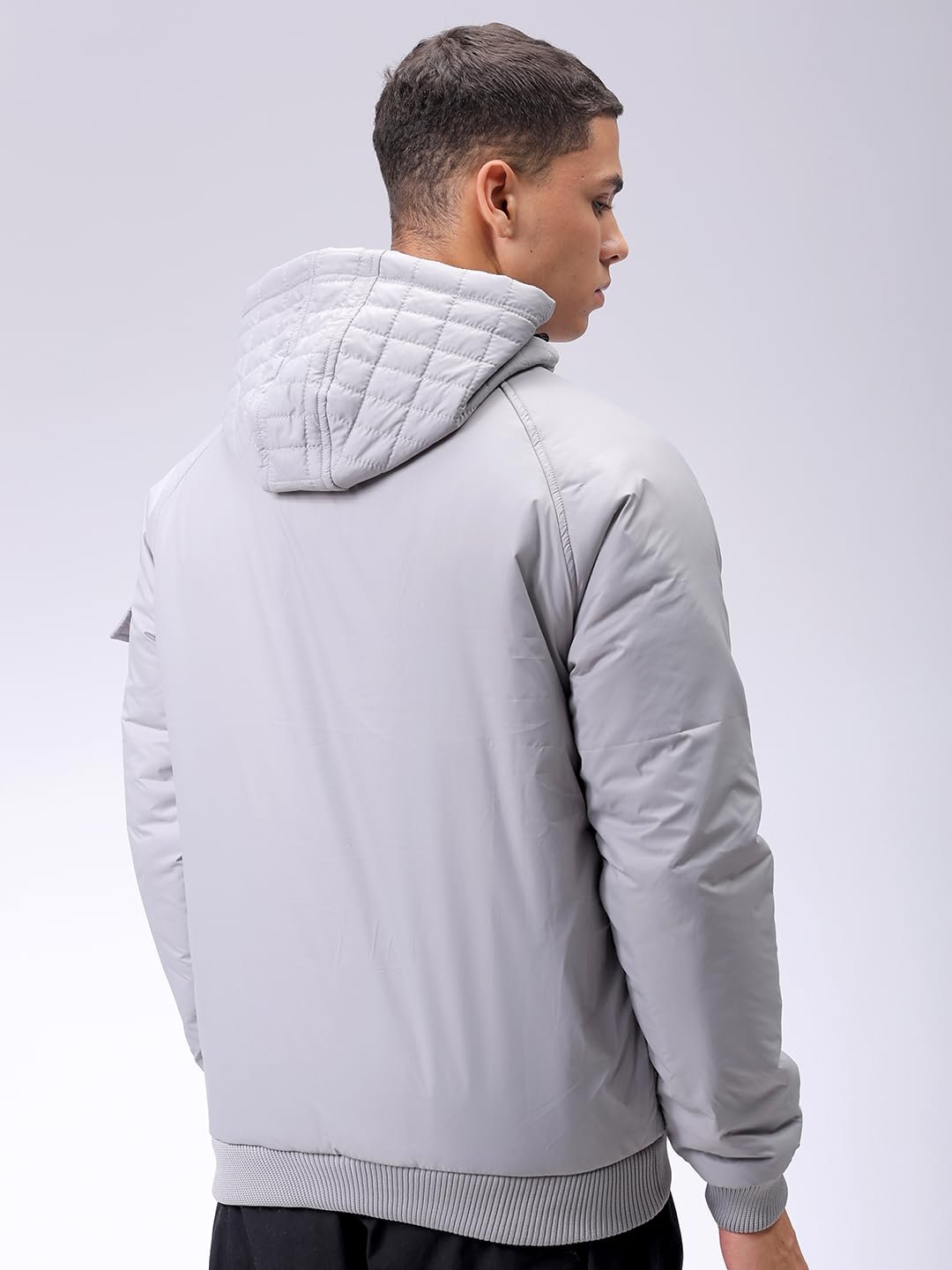 This The Indian Garage Co Men Grey Slim Fit Solid Jacket has a Long Length, Long Sleeves and Straight Hem