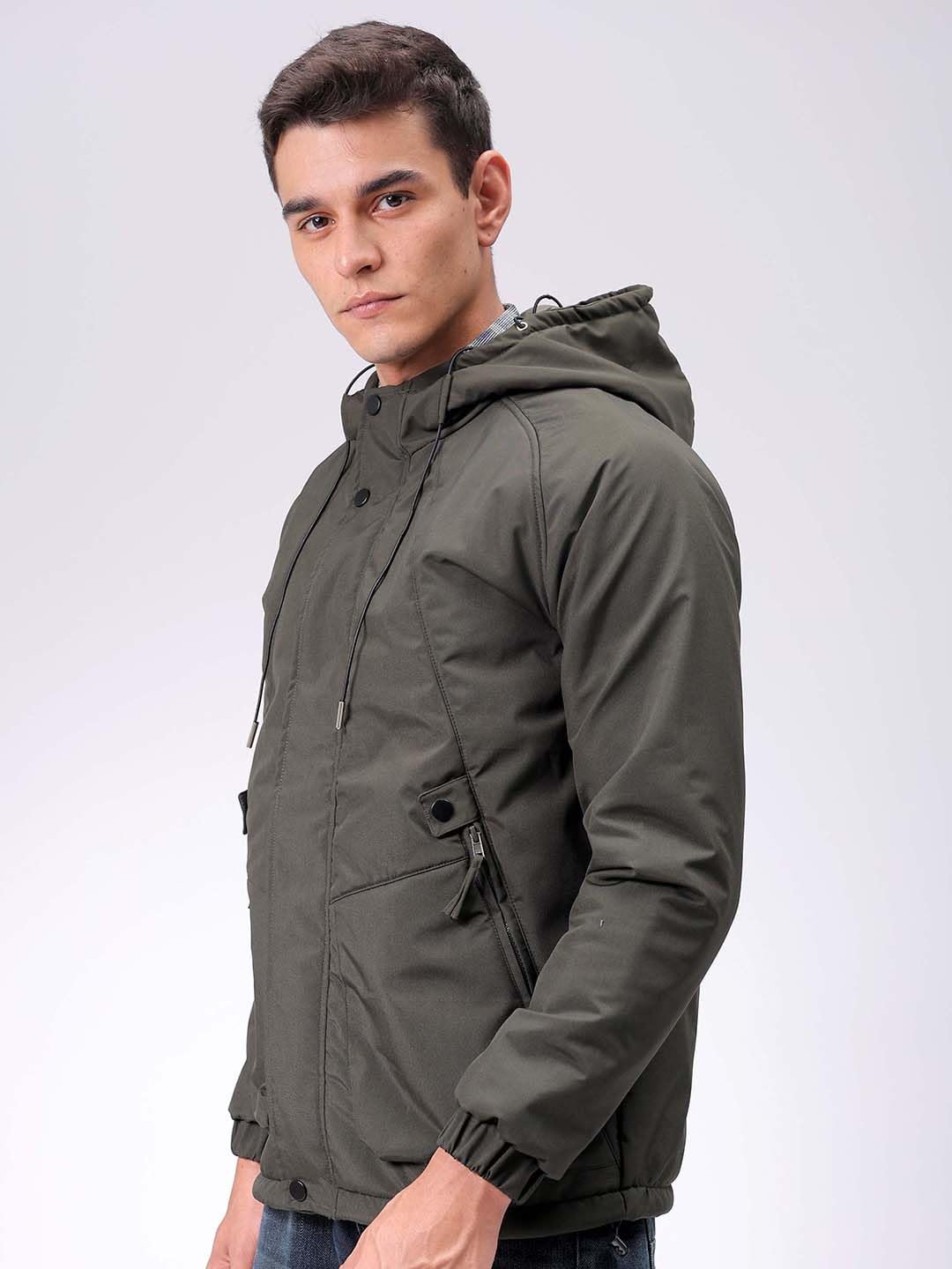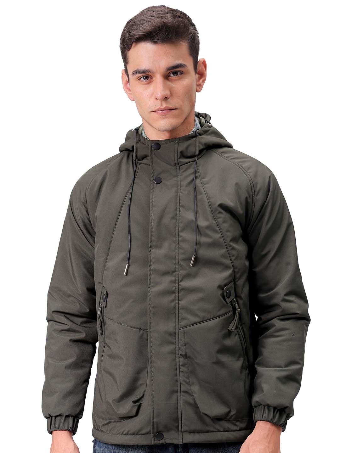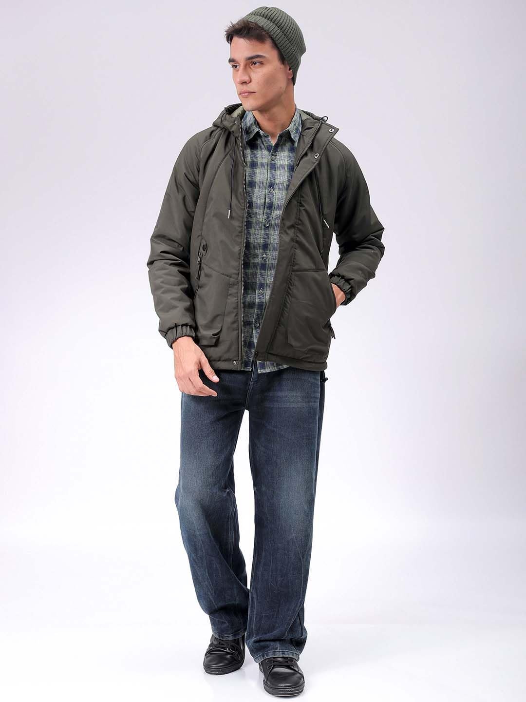 This The Indian Garage Co Men Olive Slim Fit Solid Jacket has a Regular Length, Long Sleeves and Straight Hem
