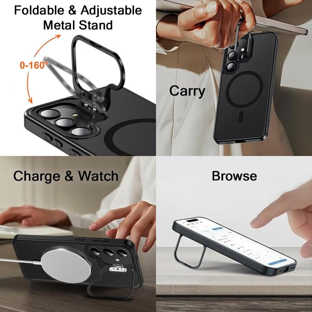The Built-In Stand is Neatly Slotted around Camera Frame and is Totally Unobtrusive, Allows Unhindered MagSafe Ring Access for Wireless Charging Simultaneously; offers stable & versatile usage like browsing or watching content with utmost convenience.