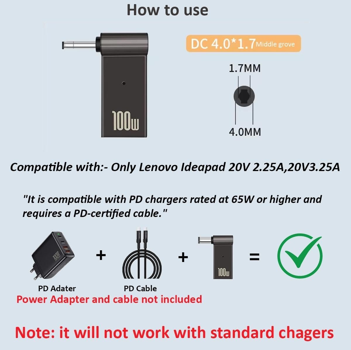 4.0X 1.7MM: Compatible with 20V/2.25A, 20V/3.25A, 20V/4.5A Laptops with Lenovo Chromebook N22 N23 N42, IdeaPad, Flex 4-1130, Liteon PA-1450-55LL, Lenovo 5A10H43627, Lenovo ADL45WCC, Lenovo IdeaPad 110-15AST, Lenovo IdeaPad 310-15ISK, Lenovo IdeaPad 120S-14IAP, Lenovo Liteon PA-1450-55LN, Notebooks E41-10, E41-15, GX20K11835, Yoga, Lenovo Flex 4 1470 80SA USB TYPE C PD CONVERTER: With the fast-charging technology, charging your laptop with the USB C PD Charger and cable is easy and efficient, saying good-bye to the traditional laptop adapter. (Need to buy Type C PD Charger and cable separately). AVOID PLUGGING AND UNPLUGGING: This Laptop adapter reduces the frequency of unplugging and plugging. You can maintain stable connections by preventing dust. Tips: This is the converter via usb type c to laptops, you need one usb c Adapter or power bank to support it. And your type c adapter or power bank should has enough power to charge your laptop. For example, your laptop’s input is 20V 2.25A, 20V 3.25A, 20V 4.5A 100W Max then your usb type c adapter should be not lower than 100W, otherwise, it will not work. Please check carefully before purchasing.