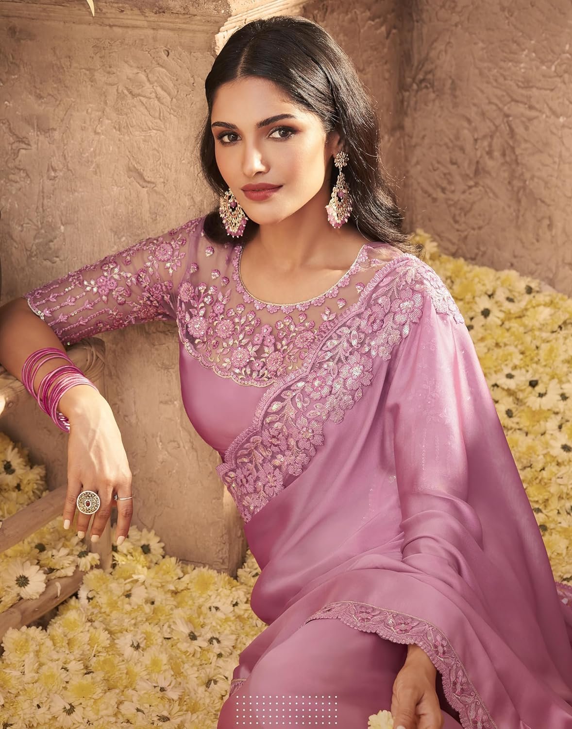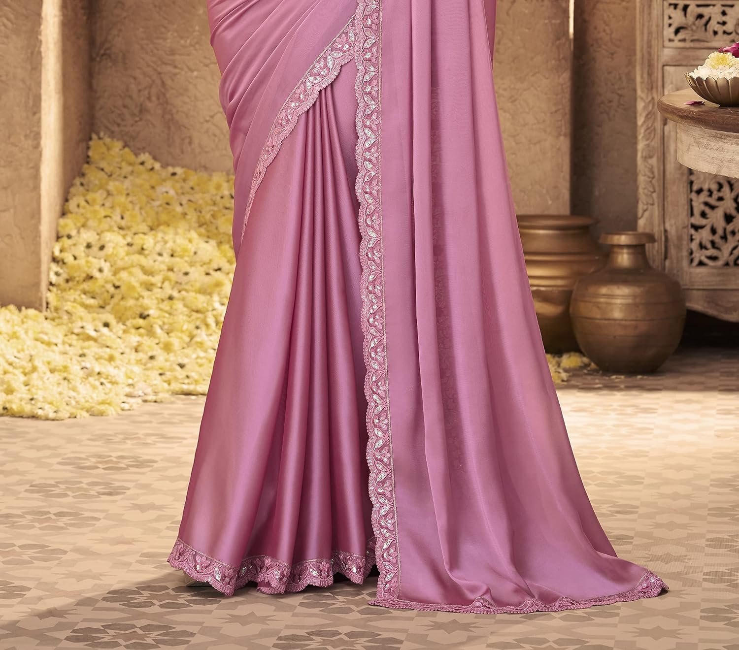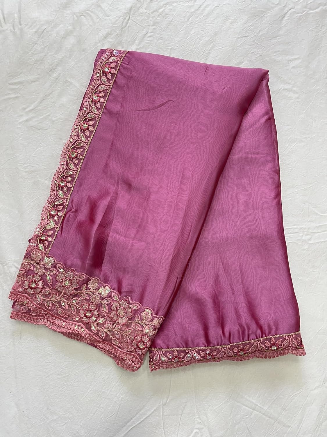 Trendmalls Pink Embroidery Saree for Women. Traditional style shiny rangoli sIlk Saree with net unstitch blouse piece which is Similar to the shade and Design of the Saree. The Saree feature is sequin embroidery border on all over saree with wide pallu border, sequin work blouse neck and sleeve fabric. These embellishments add a touch of sparkle and texture, enhancing the saree’s luxurious feel. Women can wear this Embroidery Saree for Wedding wear, functions, Party festival occasion and Best gift for your Loved ones. This saree has a traditional yet contemporary appeal, suitable for formal occasions, weddings, or festive events.
