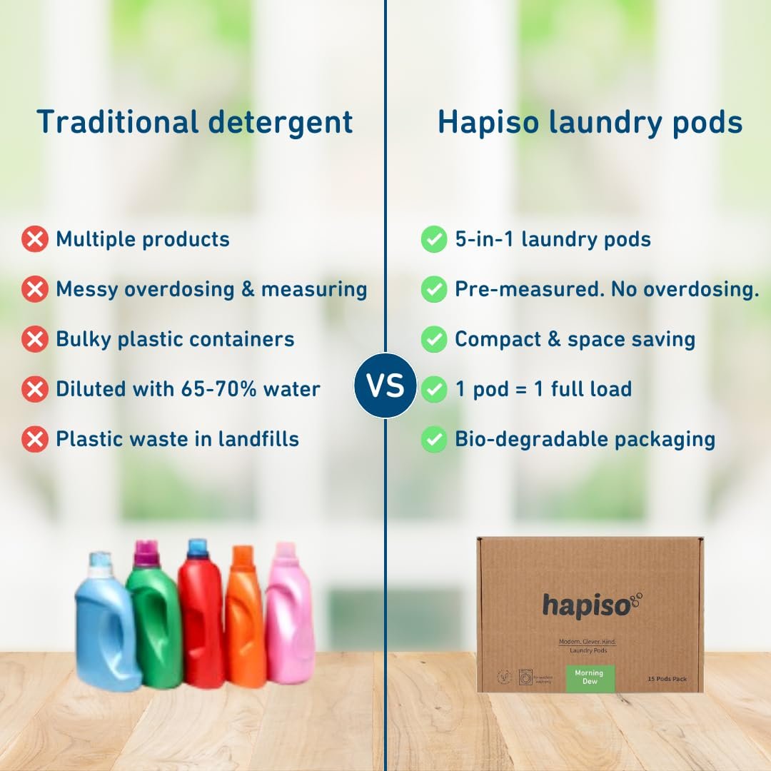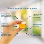 ✅ POWERFUL 5-IN-1 LIQUID DETERGENT CLEANING Hapiso Laundry Pods deliver the cleaning strength of a liquid detergent in a convenient pod format. These 5 in 1 laundry pods act as detergent, stain remover, colour protector, fabric conditioner and fragrance booster for everyday washing needs.