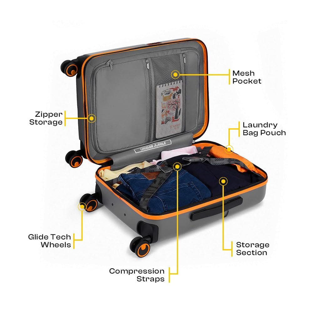 Urban Jungle by Safari Premium Cabin Spinner Trolley Bags, Polycarbonate Small (55 Cm) Suitcase with USB Charging Socket, 8 Wheel Hardside Travelling Luggage for Men & Women, Ash Grey