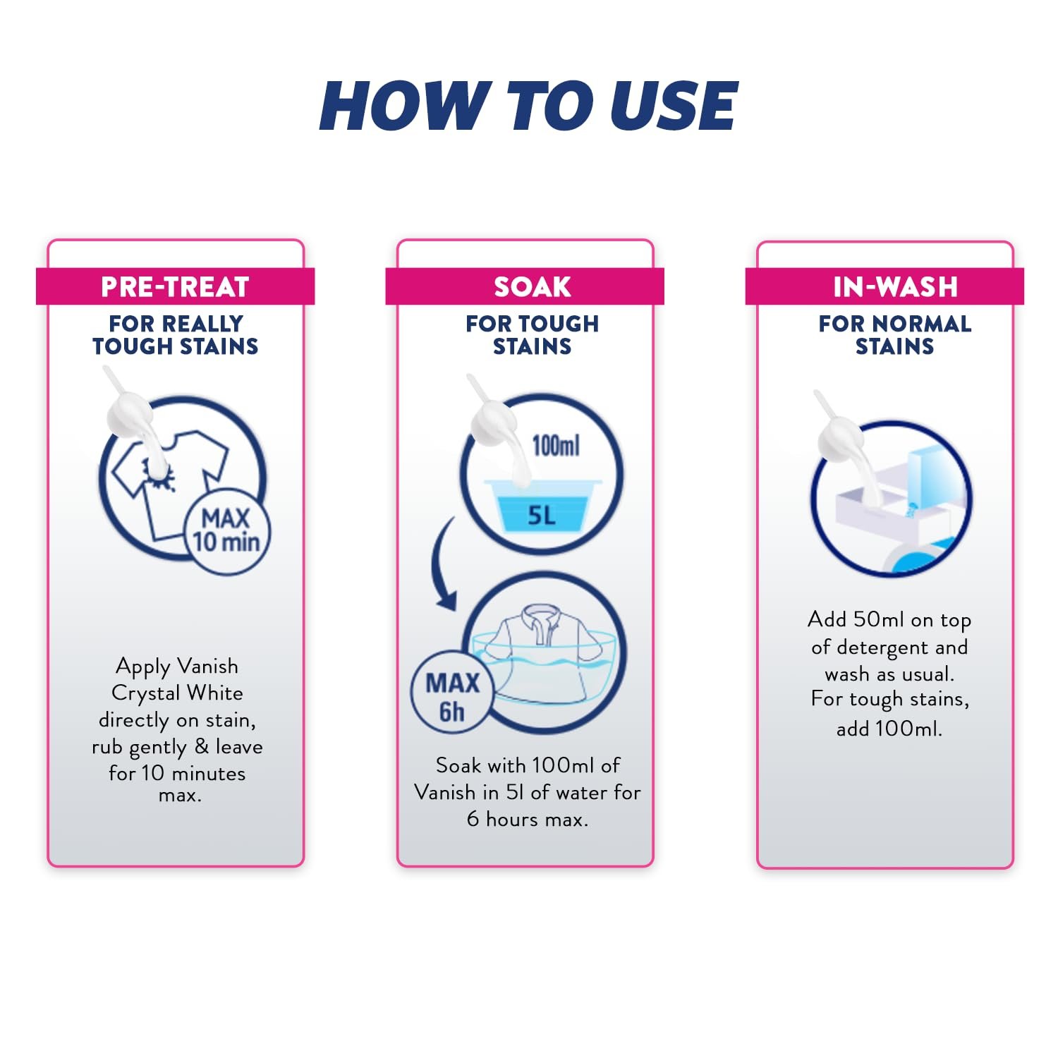 Use Vanish Crystal White eaAvailable Variants: Vanish Crystal White Liquid- 180ml & 800ml; Vanish Crystal White Powder – 100g & 400gsily with both hand wash and machine wash