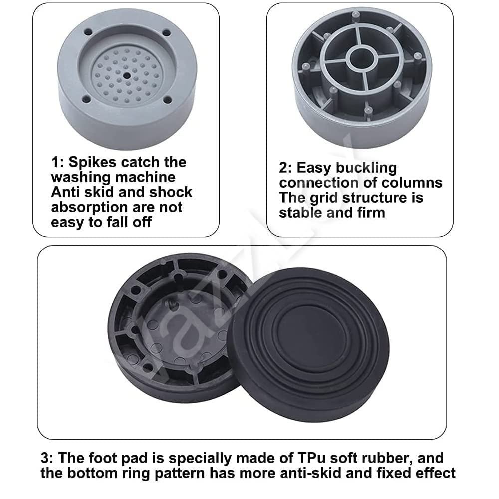 HIGH QUALITY: Washing machine feet pads are made of high quality resin fiber plastic and TPU glue. Anti vibration pad has good bearing capacity, toughness and wear resistance, moisture resistance, corrosion resistance, and can provide you with long-term service.